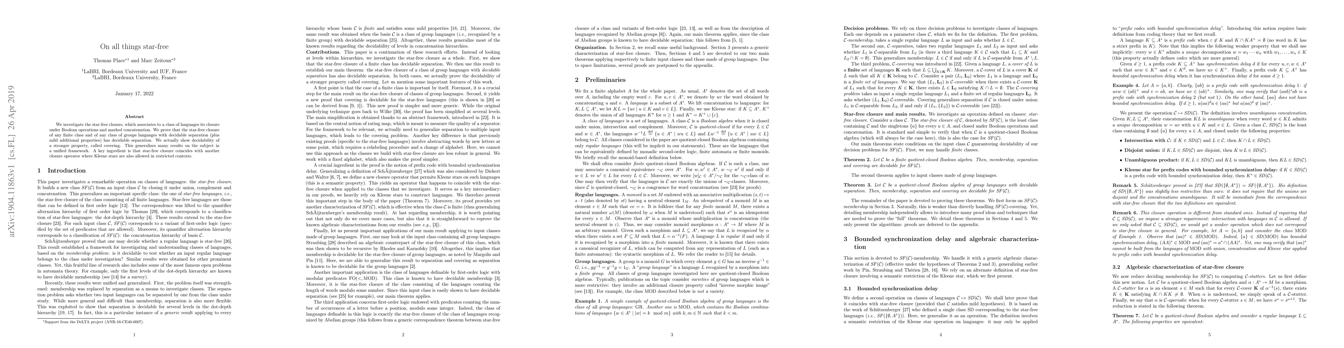 We investigate the star-free closure, which associates to a class of languages its closure under Boolean operations and marked concatenation. We prove that the star-free closure of any finite class and of any class of groups languages with decidable separation (plus mild additional properties) has decidable separation. We actually show decidability of a stronger property, called covering. This generalizes many results on the subject in a unified framework. A key ingredient is that star-free closure coincides with another closure operator where Kleene stars are also allowed in restricted contexts.