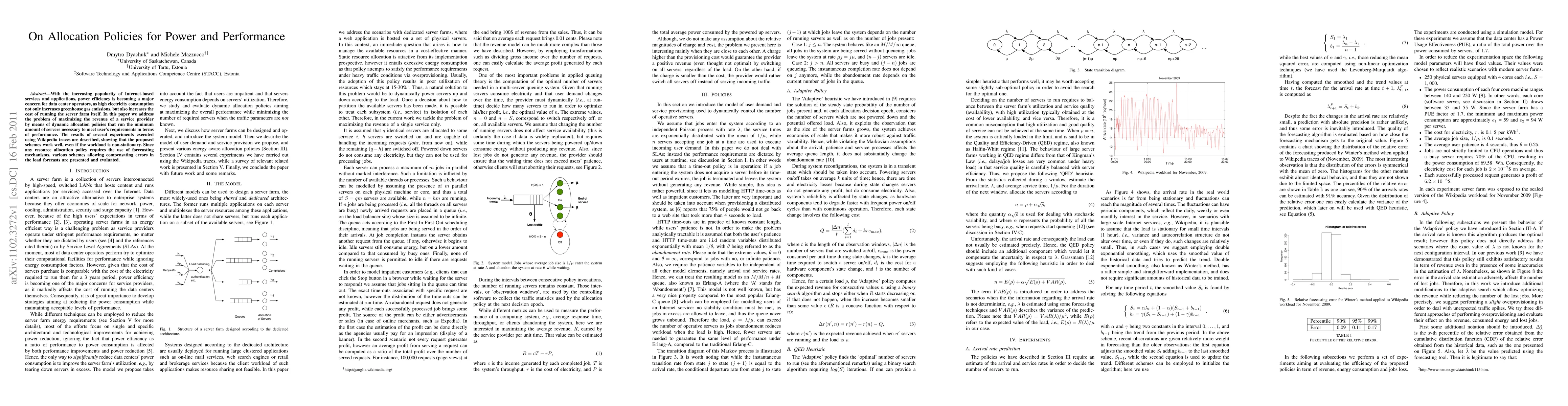With the increasing popularity of Internet-based services and applications, power efficiency is becoming a major concern for data center operators, as high electricity consumption not only increases greenhouse gas emissions, but also increases the cost of running the server farm itself. In this paper we address the problem of maximizing the revenue of a service provider by means of dynamic allocation policies that run the minimum amount of servers necessary to meet user's requirements in terms of performance. The results of several experiments executed using Wikipedia traces are described, showing that the proposed schemes work well, even if the workload is non-stationary. Since any resource allocation policy requires the use of forecasting mechanisms, various schemes allowing compensating errors in the load forecasts are presented and evaluated.