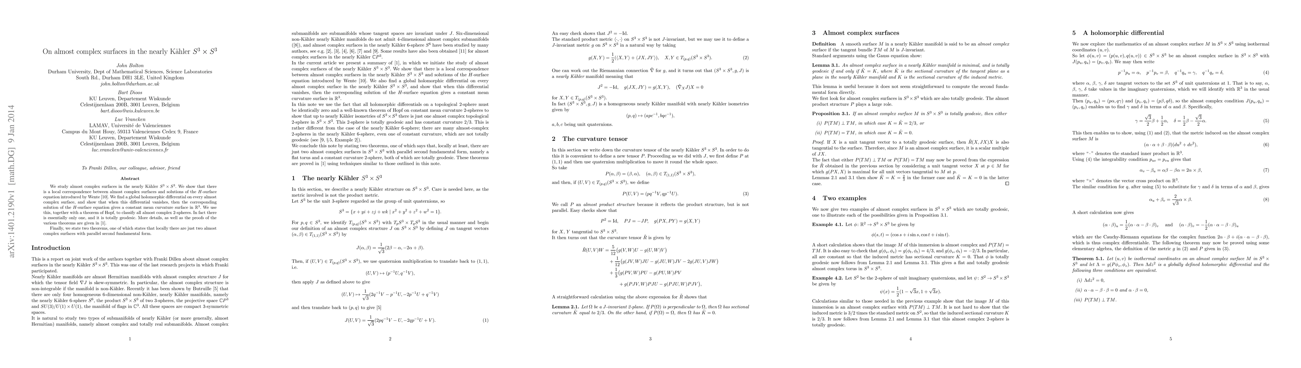 We study almost complex surfaces in the nearly K\"ahler $S^3\times S^3$. We show that there is a local correspondence between almost complex surfaces and solutions of the H-surface equation introduced by Wente. We find a global holomorphic differential on every almost complex surface, and show that when this differential vanishes, then the corresponding solution of the H-surface equation gives a constant mean curvature surface in $\mathbb{R}^3$. We use this, together with a theorem of Hopf, to classify all almost complex 2-spheres. In fact there is essentially only one, and it is totally geodesic. More details, as well as the proofs of the various theorems are given in [1]. Finally, we state two theorems, one of which states that locally there are just two almost complex surfaces with parallel second fundamental form.