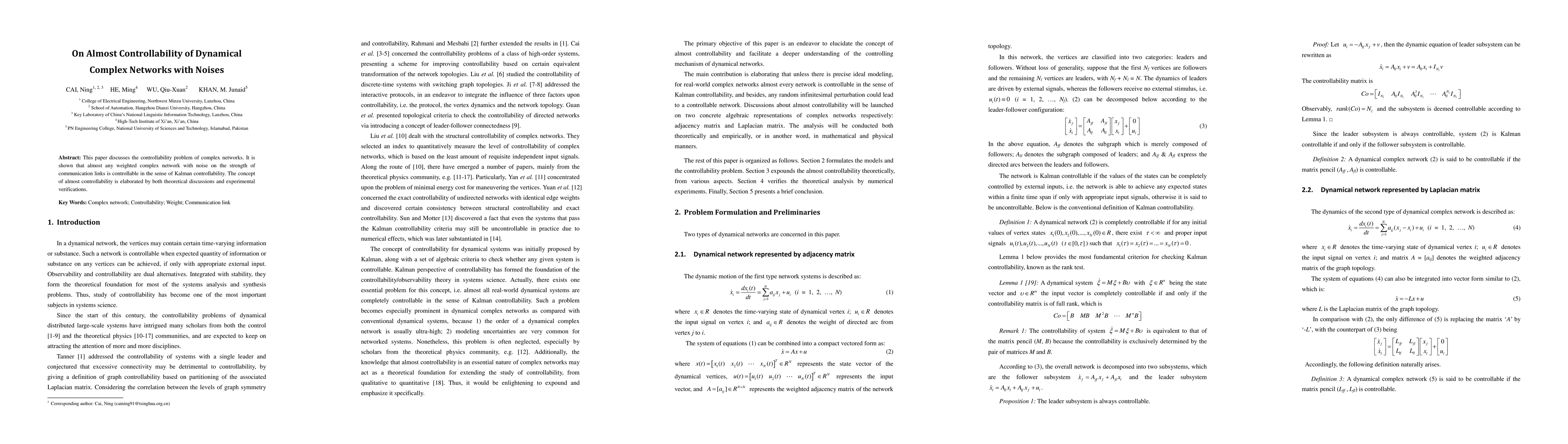 This paper explores the controllability of complex networks under noisy communication links, demonstrating that almost all such networks are controllable via Kalman controllability. Theoretical discussions and experimental verifications support the concept of almost controllability.