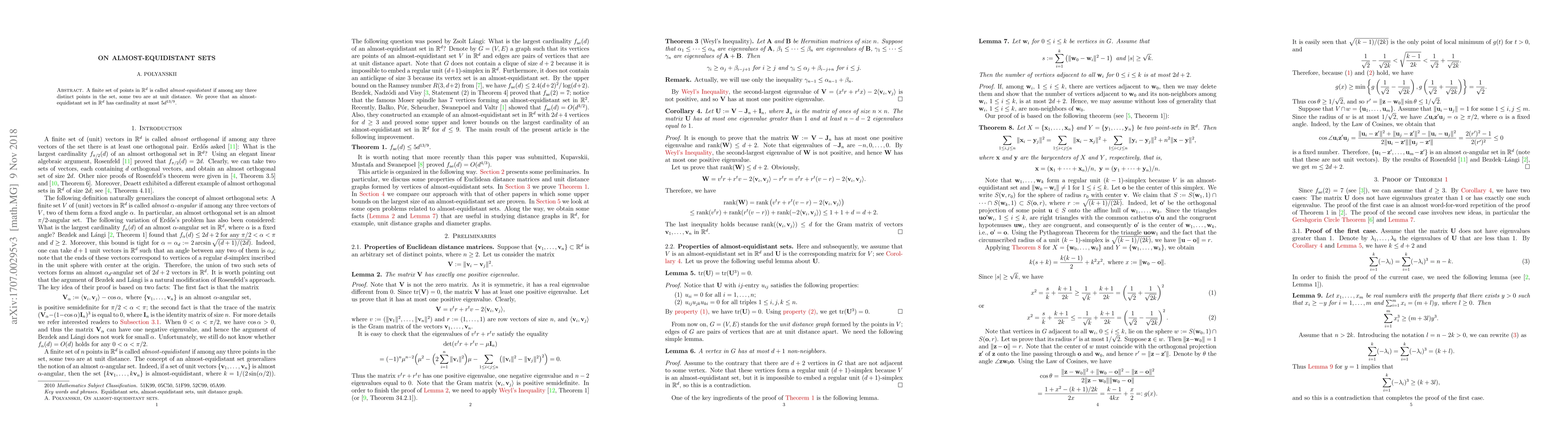 Summary: This paper investigates almost-equidistant sets in $\mathbb R^d$, where any three distinct points have at least two pairs at a unit distance. The authors prove that such sets cannot exceed a cardinality of $5d^{13/9}$ in $\mathbb R^d$.