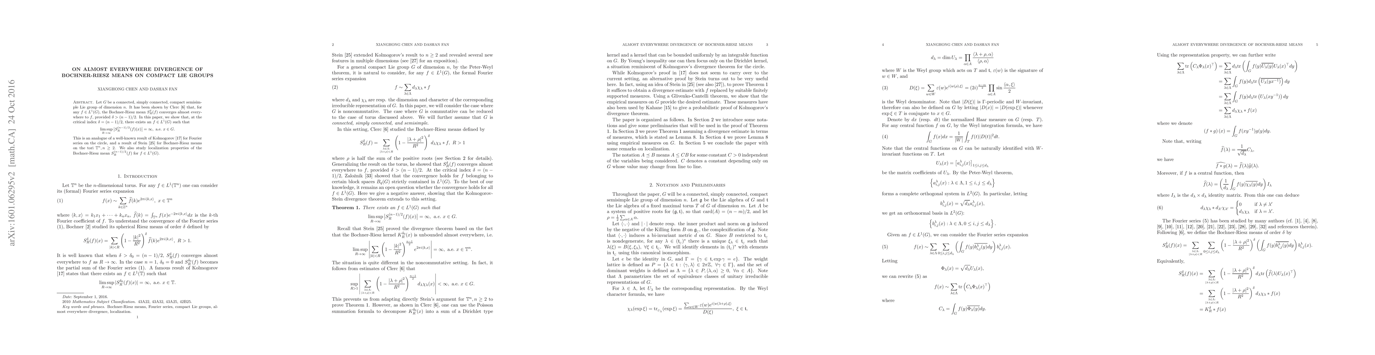 Let $G$ be a connected, simply connected, compact semisimple Lie group of dimension $n$. It has been shown by Clerc \cite{Clerc1974} that, for any $f\in L^1(G)$, the Bochner-Riesz mean $S_R^\delta(f)$ converges almost everywhere to $f$, provided $\delta>(n-1)/2$. In this paper, we show that, at the critical index $\delta=(n-1)/2$, there exists an $f\in L^1(G)$ such that $$\limsup_{R\rightarrow\infty} \big|S_{R}^{(n-1)/2}(f)(x)\big|=\infty, \ \text{a.e.}\ x\in G.$$ This is an analogue of a well-known result of Kolmogorov \cite{Kolmogoroff1923} for Fourier series on the circle, and a result of Stein \cite{Stein1961} for Bochner-Riesz means on the tori $\mathbb T^{n}, n\geq 2$. We also study localization properties of the Bochner-Riesz mean $S_{R}^{(n-1)/2}(f)$ for $f\in L^1(G)$.
