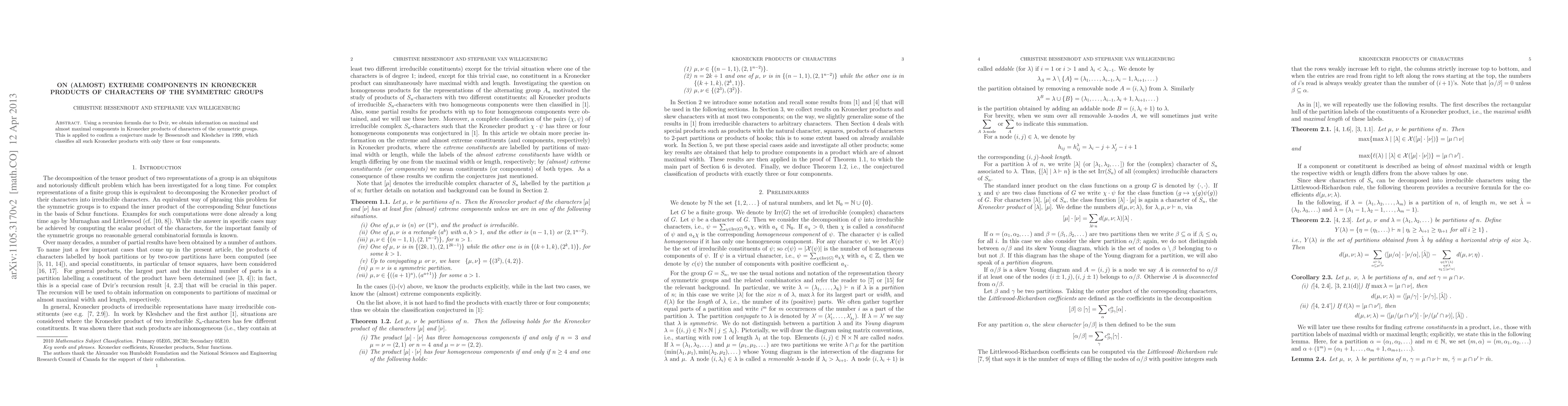 Summary: This paper utilizes Dvir's recursion formula to analyze maximal and almost maximal components in Kronecker products of symmetric group characters, confirming a 1999 conjecture by Bessenrodt and Kleshchev that classifies such products with only three or four components.