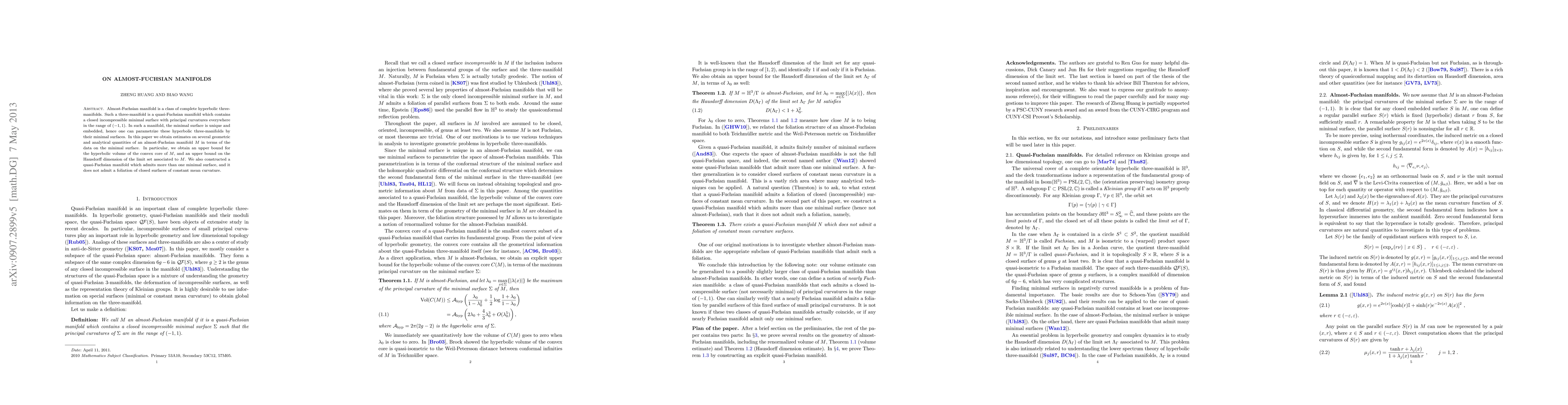 Almost-Fuchsian manifold is a class of complete hyperbolic three manifolds. Such a three-manifold is a quasi-Fuchsian manifold which contains a closed incompressible minimal surface with principal curvatures everywhere in the range of (-1, 1). In such a manifold, the minimal surface is unique and embedded, hence one can parametrize these hyperbolic three-manifolds by their minimal surfaces. In this paper we obtain estimates on several geometric and analytical quantities of an almost-Fuchsian manifold M in terms of the data on the minimal surface. In particular, we obtain an upper bound for the hyperbolic volume of the convex core of M, and an upper bound on the Hausdor? dimension of the limit set associated to M. We also constructed a quasi-Fuchsian manifold which admits more than one minimal surface, and it does not admit a foliation of closed surfaces of constant mean curvature.