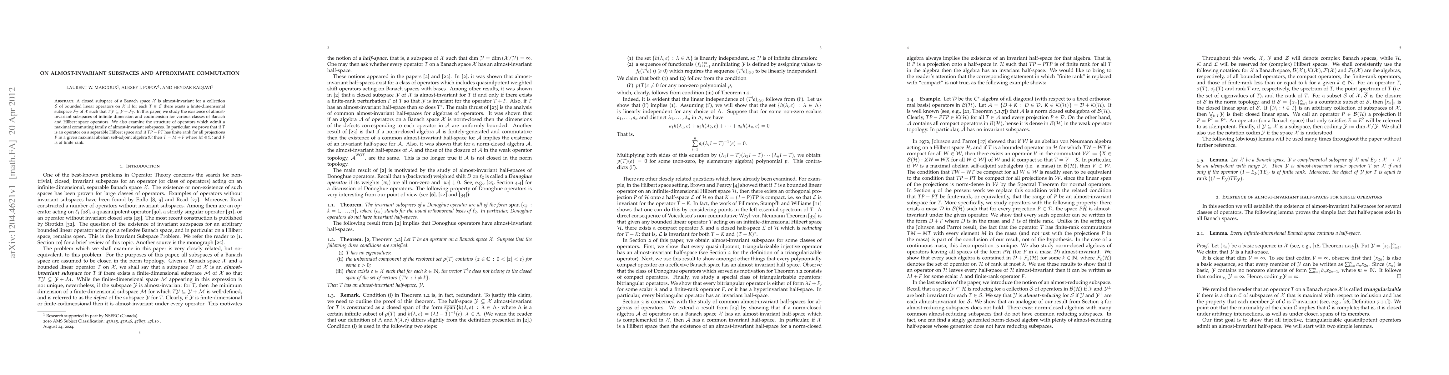 The paper introduces and develops the concept of almost-invariant subspaces, providing conditions under which such subspaces exist and characterizing operators with specific commutation properties.