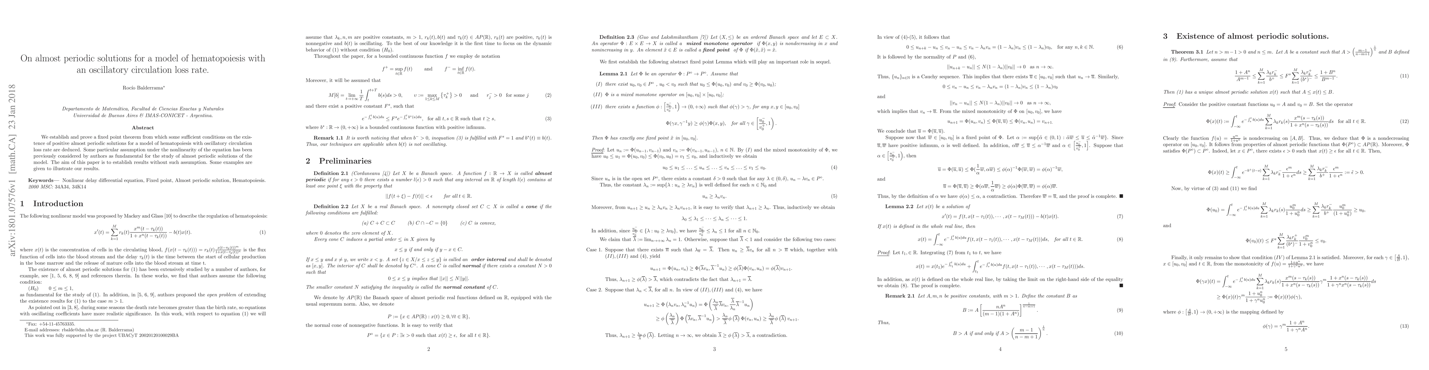 We establish and prove a fixed point theorem from which some sufficient conditions on the existence of positive almost periodic solutions for a model of hematopoiesis with oscillatory circulation loss rate are deduced. Some particular assumption under the nonlinearity of the equation has been previously considered by authors as fundamental for the study of almost periodic solutions of the model. The aim of this paper is to establish results without such assumption. Some examples are given to illustrate our results.