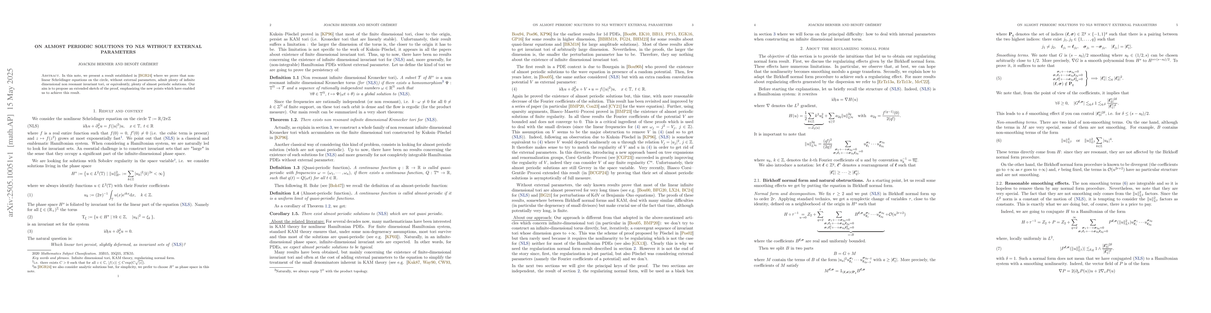 In this note, we present a result established in [BGR24] where we prove that nonlinear Schrodinger equations on the circle, without external parameters, admit plenty of infinite dimensional non resonant invariant tori, or equivalently, plenty of almost periodic solutions. Our aim is to propose an extended sketch of the proof, emphasizing the new points which have enabled us to achieve this result.
