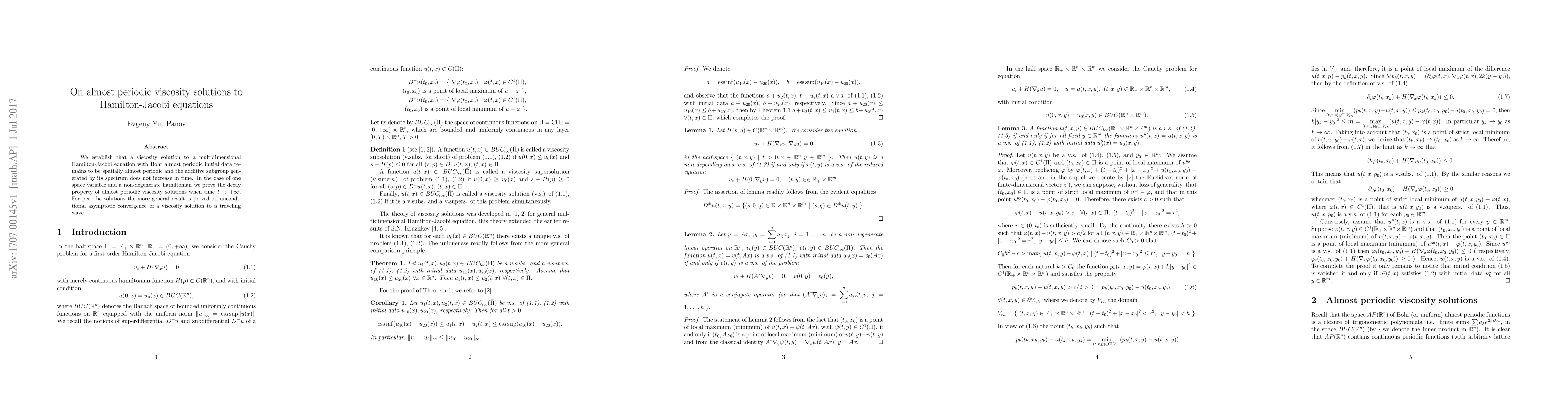 We establish that a viscosity solution to a multidimensional Hamilton-Jacobi equation with Bohr almost periodic initial data remains to be spatially almost periodic and the additive subgroup generated by its spectrum does not increase in time. In the case of one space variable and a non-degenerate hamiltonian we prove the decay property of almost periodic viscosity solutions when time $t\to+\infty$. For periodic solutions the more general result is proved on unconditional asymptotic convergence of a viscosity solution to a traveling wave.
