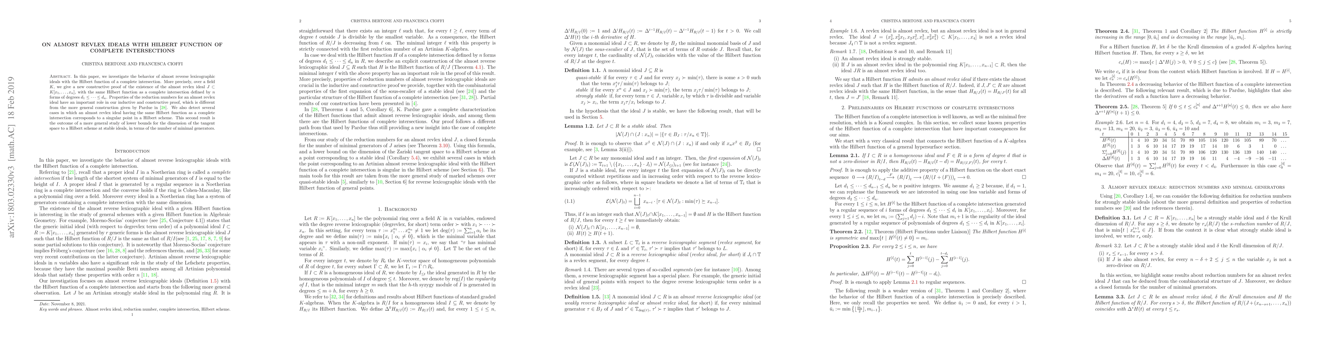 This paper provides a new constructive proof for the existence of almost reverse lexicographic ideals $J$ in $K[x_1,\dots,x_n]$ matching the Hilbert function of a complete intersection defined by $n$ forms, highlighting the role of reduction numbers in the proof and identifying cases where such ideals correspond to singular points in a Hilbert scheme.