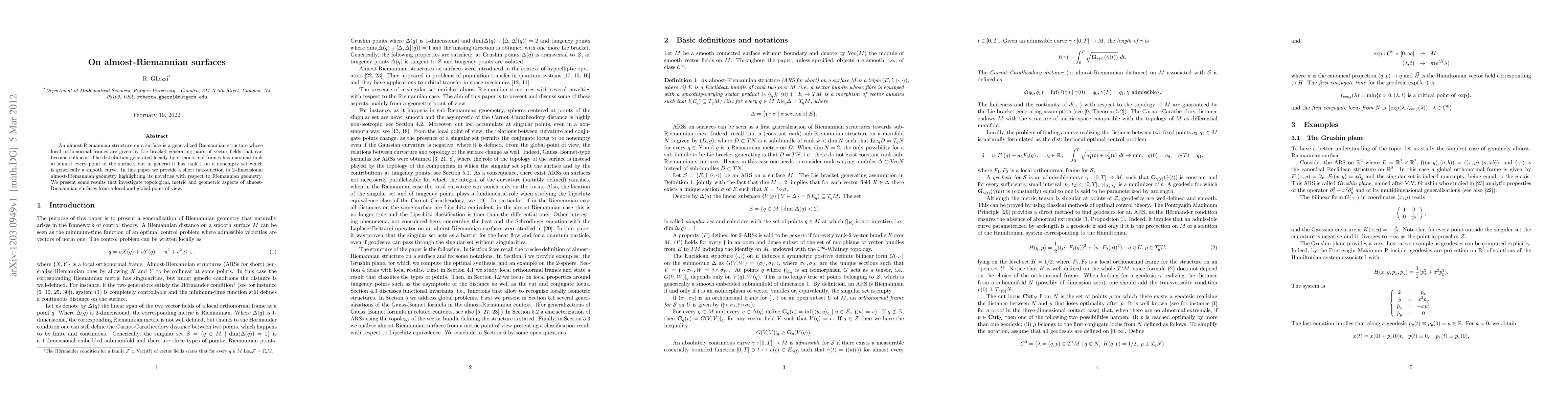 An almost-Riemannian structure on a surface is a generalized Riemannian structure whose local orthonormal frames are given by Lie bracket generating pairs of vector fields that can become collinear. The distribution generated locally by orthonormal frames has maximal rank at almost every point of the surface, but in general it has rank 1 on a nonempty set which is generically a smooth curve. In this paper we provide a short introduction to 2-dimensional almost-Riemannian geometry highlighting its novelties with respect to Riemannian geometry. We present some results that investigate topological, metric and geometric aspects of almost- Riemannian surfaces from a local and global point of view.