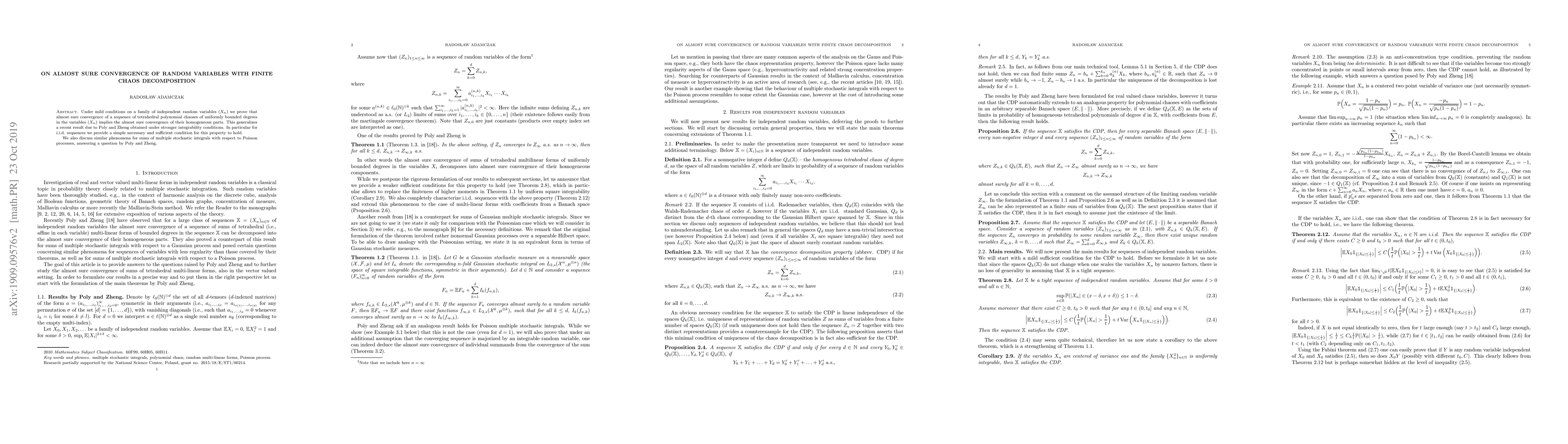 This paper proves that under mild conditions, the almost sure convergence of tetrahedral polynomial chaoses of independent random variables implies the almost sure convergence of their homogeneous parts, generalizing a previous result. It also provides a necessary and sufficient condition for this property in i.i.d. sequences and discusses similar phenomena for sums of stochastic integrals with respect to Poisson processes.
