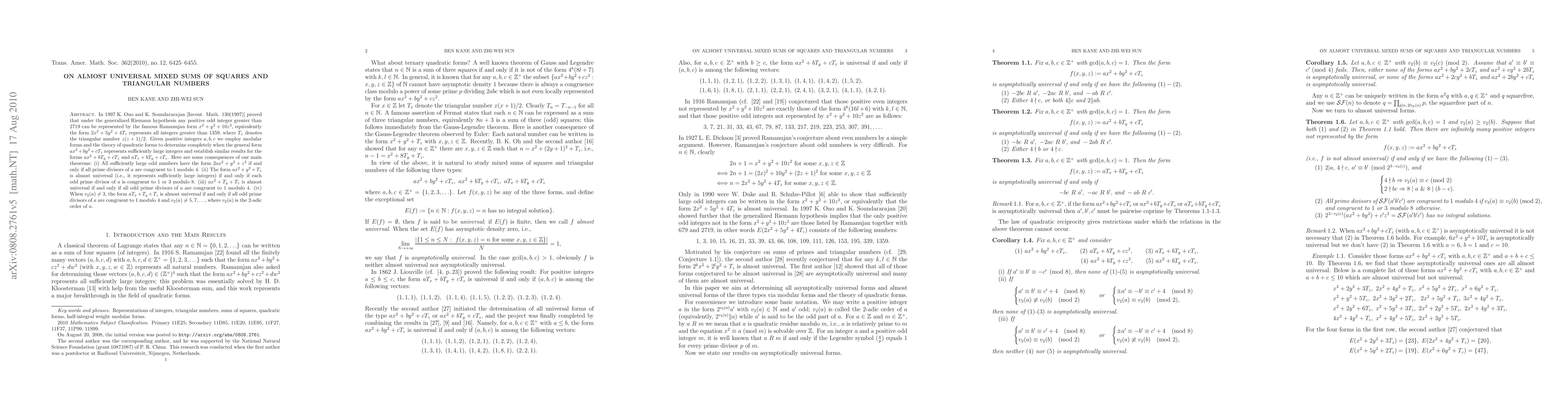 In 1997 K. Ono and K. Soundararajan [Invent. Math. 130(1997)] proved that under the generalized Riemann hypothesis any positive odd integer greater than 2719 can be represented by the famous Ramanujan form $x^2+y^2+10z^2$, equivalently the form $2x^2+5y^2+4T_z$ represents all integers greater than 1359, where $T_z$ denotes the triangular number $z(z+1)/2$. Given positive integers $a,b,c$ we employ modular forms and the theory of quadratic forms to determine completely when the general form $ax^2+by^2+cT_z$ represents sufficiently large integers and establish similar results for the forms $ax^2+bT_y+cT_z$ and $aT_x+bT_y+cT_z$. Here are some consequences of our main theorems: (i) All sufficiently large odd numbers have the form $2ax^2+y^2+z^2$ if and only if all prime divisors of $a$ are congruent to 1 modulo 4. (ii) The form $ax^2+y^2+T_z$ is almost universal (i.e., it represents sufficiently large integers) if and only if each odd prime divisor of $a$ is congruent to 1 or 3 modulo 8. (iii) $ax^2+T_y+T_z$ is almost universal if and only if all odd prime divisors of $a$ are congruent to 1 modulo 4. (iv) When $v_2(a)\not=3$, the form $aT_x+T_y+T_z$ is almost universal if and only if all odd prime divisors of $a$ are congruent to 1 modulo 4 and $v_2(a)\not=5,7,...$, where $v_2(a)$ is the 2-adic order of $a$.
