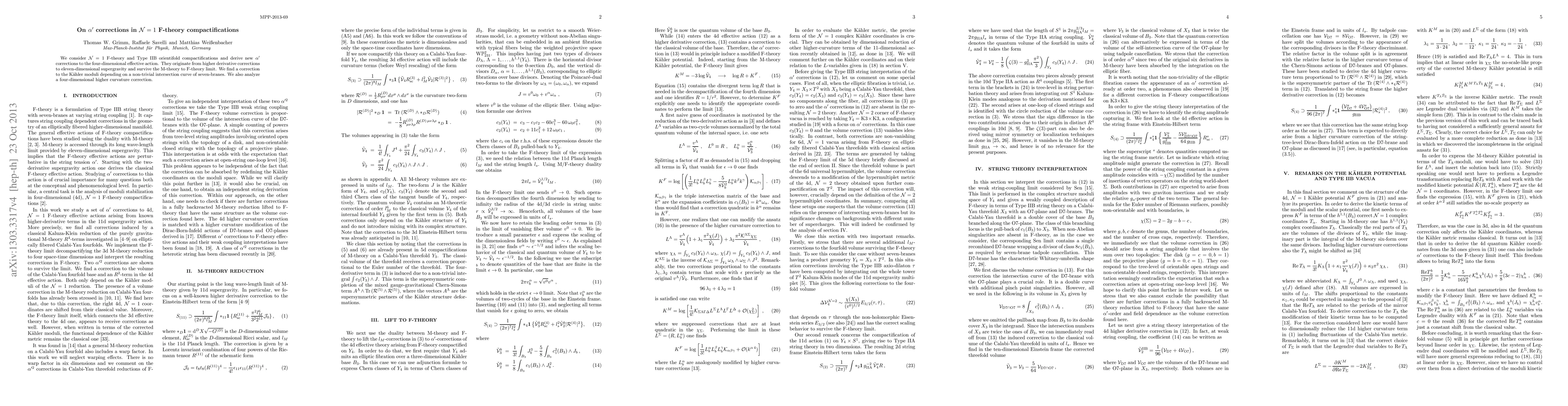 This paper derives new \(\alpha'\) corrections to the four-dimensional effective action in N=1 F-theory and Type IIB orientifold compactifications, originating from higher derivative corrections in eleven-dimensional supergravity. It identifies a correction to the Kähler moduli tied to a non-trivial intersection curve of seven-branes and examines a four-dimensional higher curvature correction.