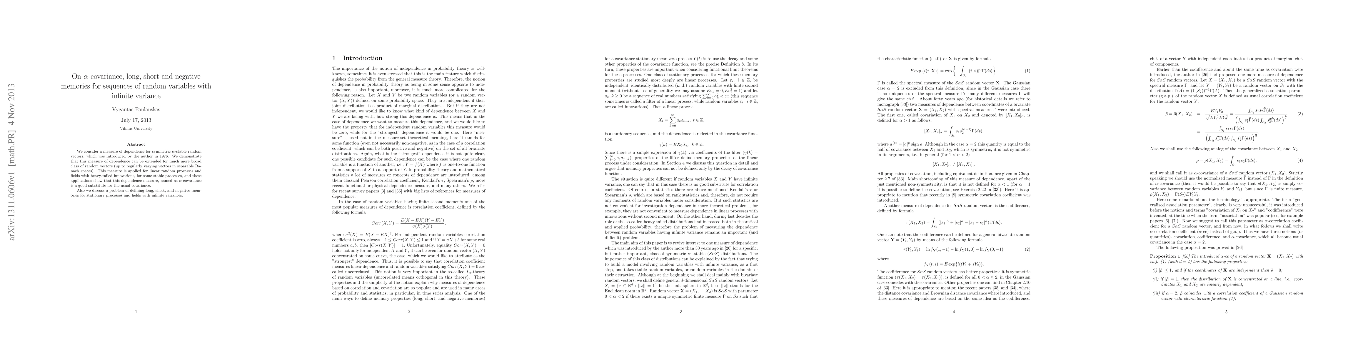 We consider a measure of dependence for symmetric $\alpha$-stable random vectors, which was introduced by the author in 1976. We demonstrate that this measure of dependence can be extended for much more broad class of random vectors (up to regularly varying vectors in separable Banach spaces). This measure is applied for linear random processes and fields with heavy-tailed innovations, for some stable processes, and these applications show that this dependence measure, named as $\alpha$-covariance is a good substitute for the usual covariance. Also we discuss a problem of defining long, short, and negative memories for stationary processes and fields with infinite variances.