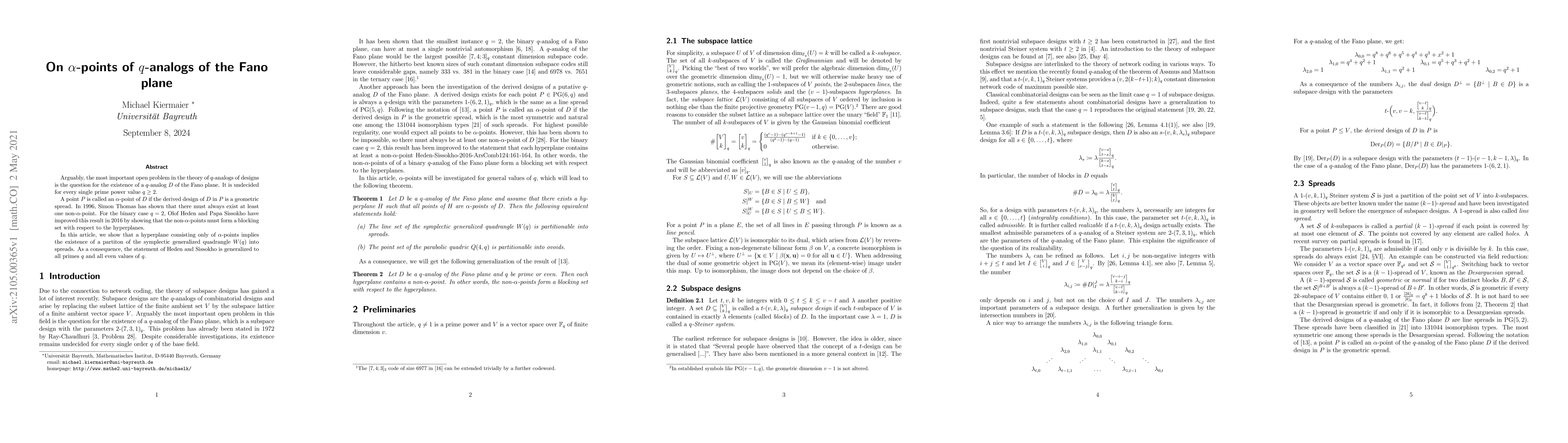 This paper explores the existence of $\alpha$-points in $q$-analogs of the Fano plane, proving that a hyperplane composed solely of $\alpha$-points necessitates the partitioning of the symplectic generalized quadrangle $W(q)$ into spreads. It generalizes previous results on non-$\alpha$-points to all prime powers $q$.