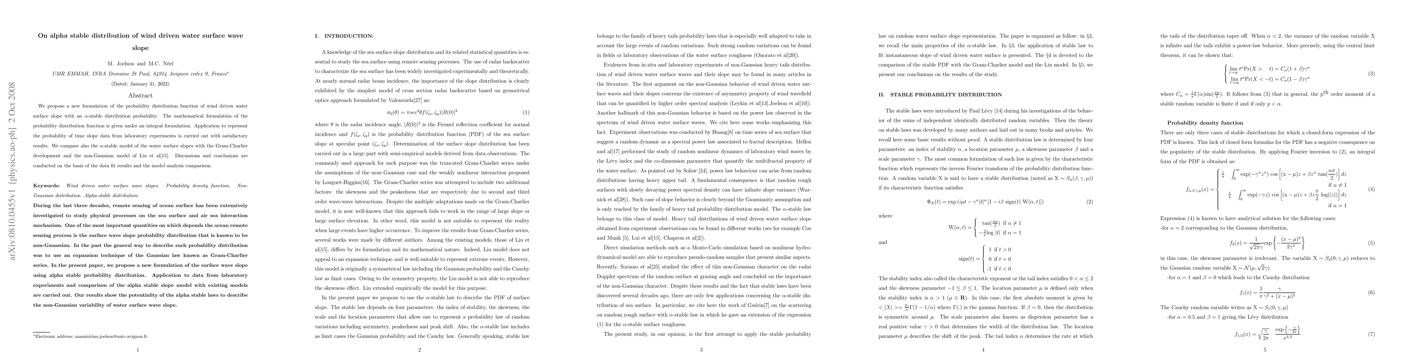 We propose a new formulation of the probability distribution function of wind driven water surface slope with an $\alpha$-stable distribution probability. The mathematical formulation of the probability distribution function is given under an integral formulation. Application to represent the probability of time slope data from laboratory experiments is carried out with satisfactory results. We compare also the $\alpha$-stable model of the water surface slopes with the Gram-Charlier development and the non-Gaussian model of Liu et al\cite{Liu}. Discussions and conclusions are conducted on the basis of the data fit results and the model analysis comparison.