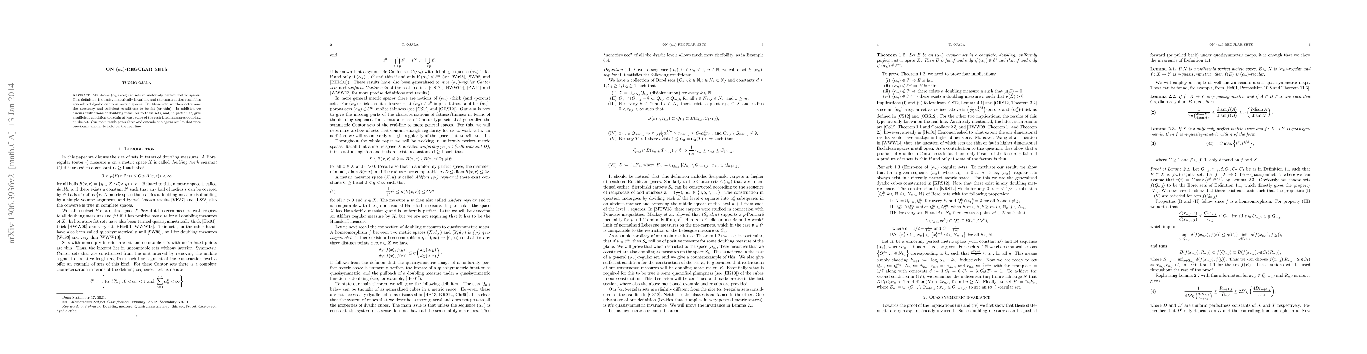 We define $(\alpha_n)$ -regular sets in uniformly perfect metric spaces. This definition is quasisymmetrically invariant and the construction resembles generalized dyadic cubes in metric spaces. For these sets we then determine the necessary and sufficient conditions to be fat (or thin). In addition we discuss restrictions of doubling measures to these sets, and in particular give a sufficient condition to retain at least some of the restricted measures doubling on the set. Our main result generalizes and extends analogous results that were previously known to hold in the real-line.