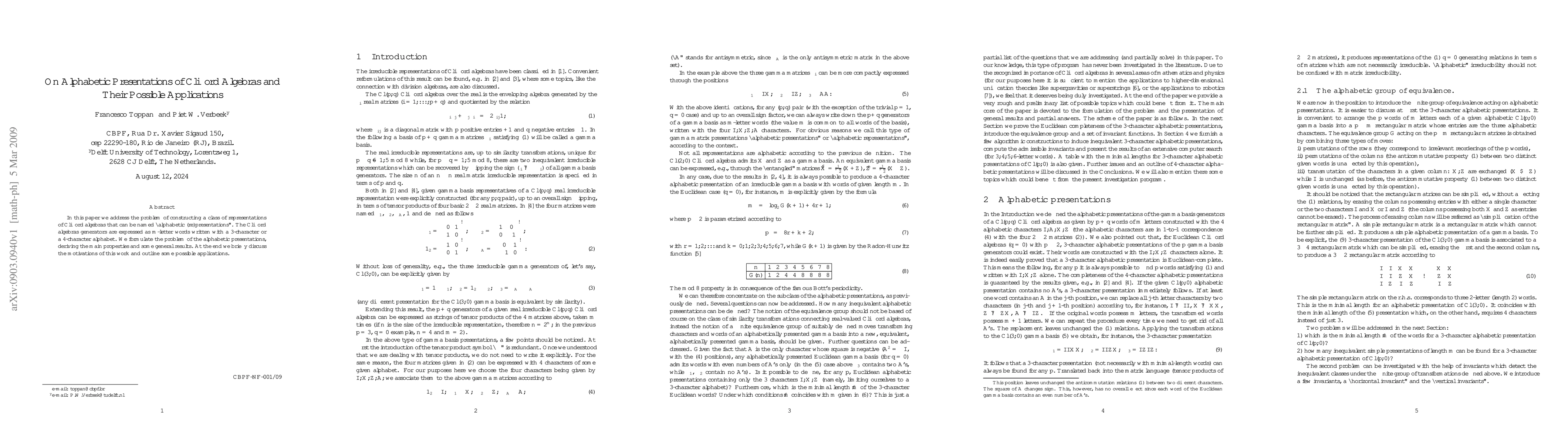 This paper introduces "alphabetic presentations" for Clifford algebras, representing their generators as m-letter words using a 3- or 4-character alphabet, and explores potential applications and implications of these representations.