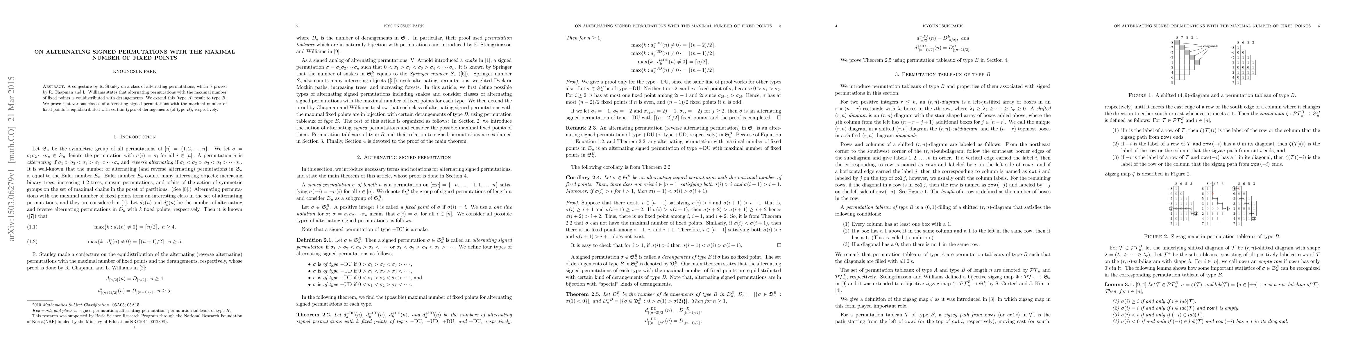 This paper proves that alternating signed permutations with the maximal number of fixed points are equidistributed with certain types of derangements of type $B$, extending the previously established result for type $A$ permutations.