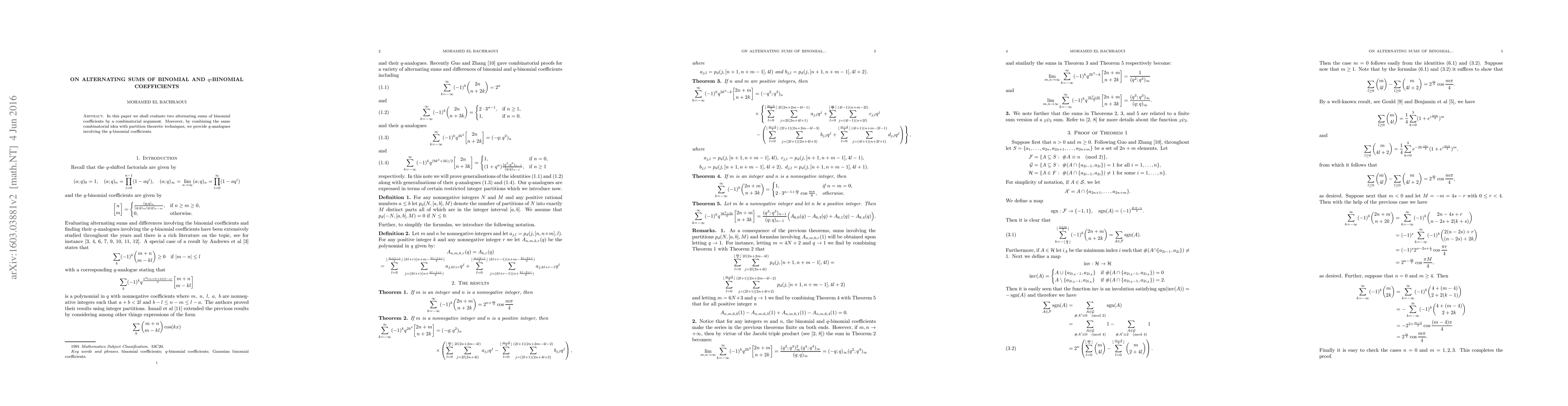 Summary: This paper evaluates two alternating sums of binomial coefficients using combinatorial arguments and extends the results to $q$-analogues involving $q$-binomial coefficients through partition theoretic techniques.