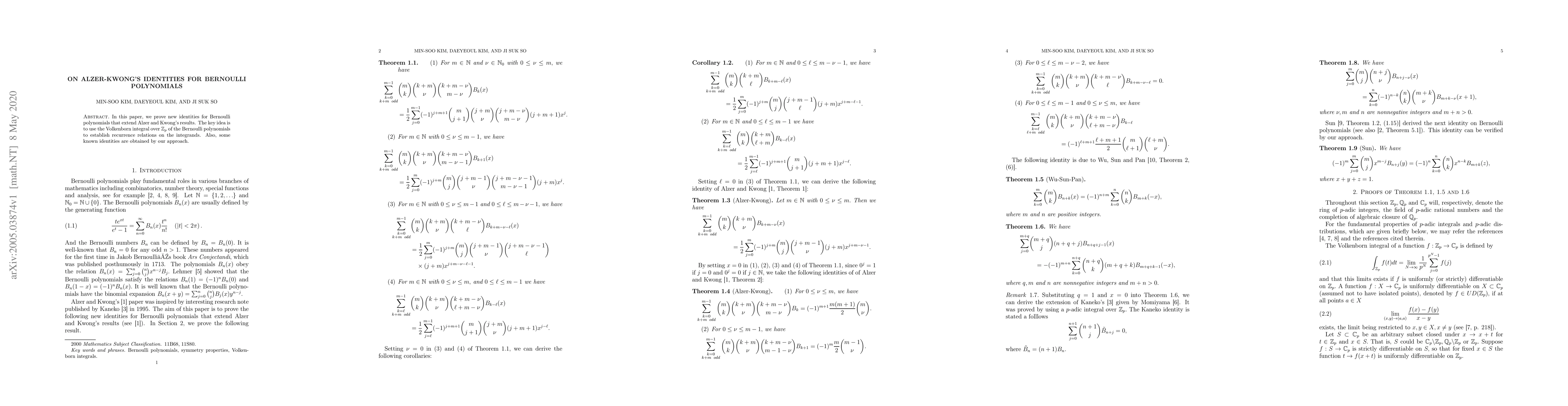 This paper extends Alzer and Kwong's identities for Bernoulli polynomials by employing the Volkenborn integral over $\mathbb Z_p$ to derive new recurrence relations and recover known identities. The Volkenborn integral plays a crucial role in establishing these novel results.