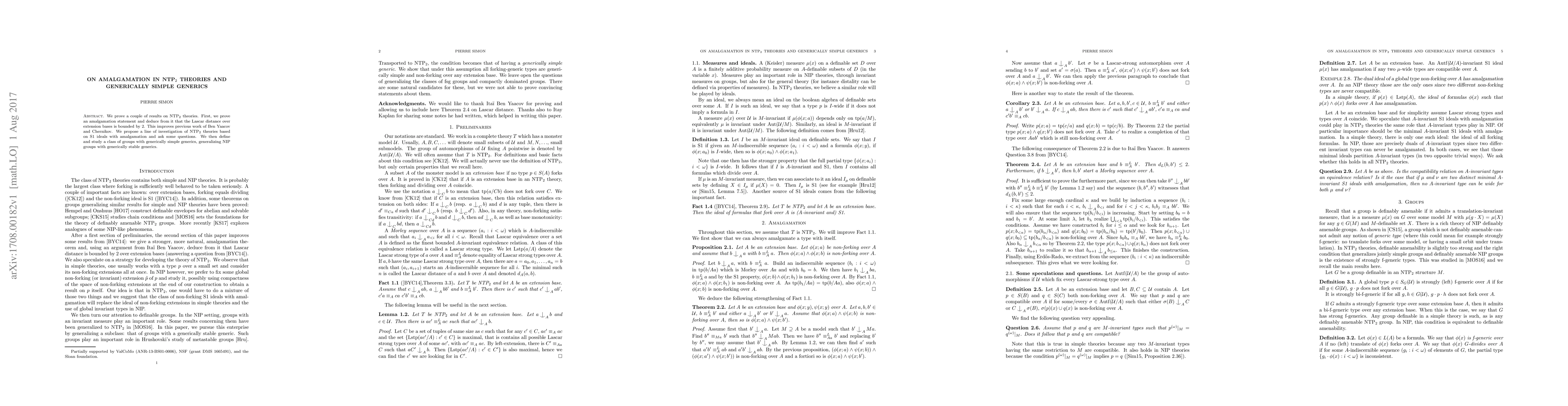 This paper proves an amalgamation result for NTP2 theories, showing that the Lascar distance over extension bases is bounded by 2, improving on previous results. It also introduces a new class of groups with generically simple generics, extending the concept from NIP groups.