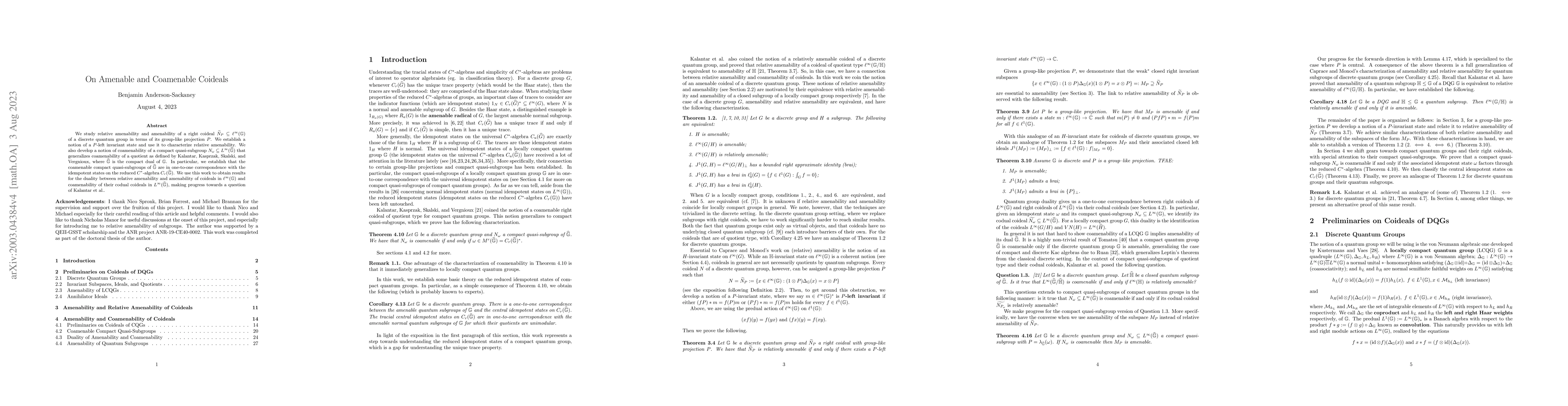 We study relative amenability and amenability of a right coideal $\widetilde{N}_P\subseteq \ell^\infty(\mathbb{G})$ of a discrete quantum group in terms of its group-like projection $P$. We establish a notion of a $P$-left invariant state and use it to characterize relative amenability. We also develop a notion of coamenability of a compact quasi-subgroup $N_\omega\subseteq L^\infty(\widehat{\mathbb{G}})$ that generalizes coamenability of a quotient as defined by Kalantar, Kasprzak, Skalski, and Vergnioux, where $\widehat{\mathbb{G}}$ is the compact dual of $\mathbb{G}$. In particular, we establish that the coamenable compact quasi-subgroups of $\widehat{\mathbb{G}}$ are in one-to-one correspondence with the idempotent states on the reduced $C^*$-algebra $C_r(\widehat{\mathbb{G}})$. We use this work to obtain results for the duality between relative amenability and amenability of coideals in $\ell^\infty(\mathbb{G})$ and coamenability of their codual coideals in $L^\infty(\widehat{\mathbb{G}})$, making progress towards a question of Kalantar et al{.}.