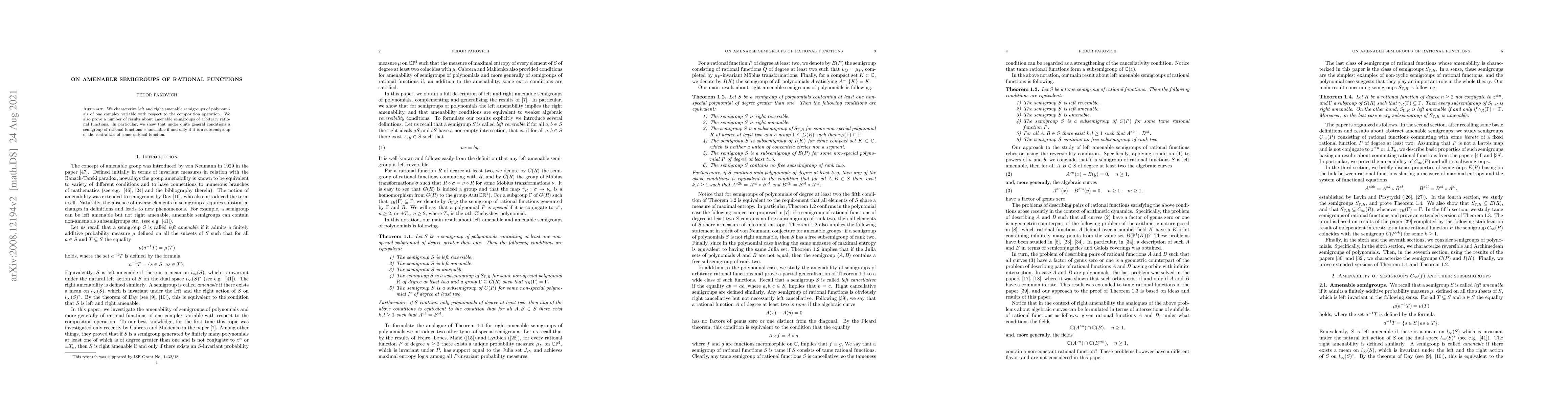 This paper characterizes left and right amenable semigroups of polynomials and rational functions with respect to composition, proving that left amenability of a semigroup of rational functions occurs if it is a subsemigroup of the centralizer of some rational function under general conditions.