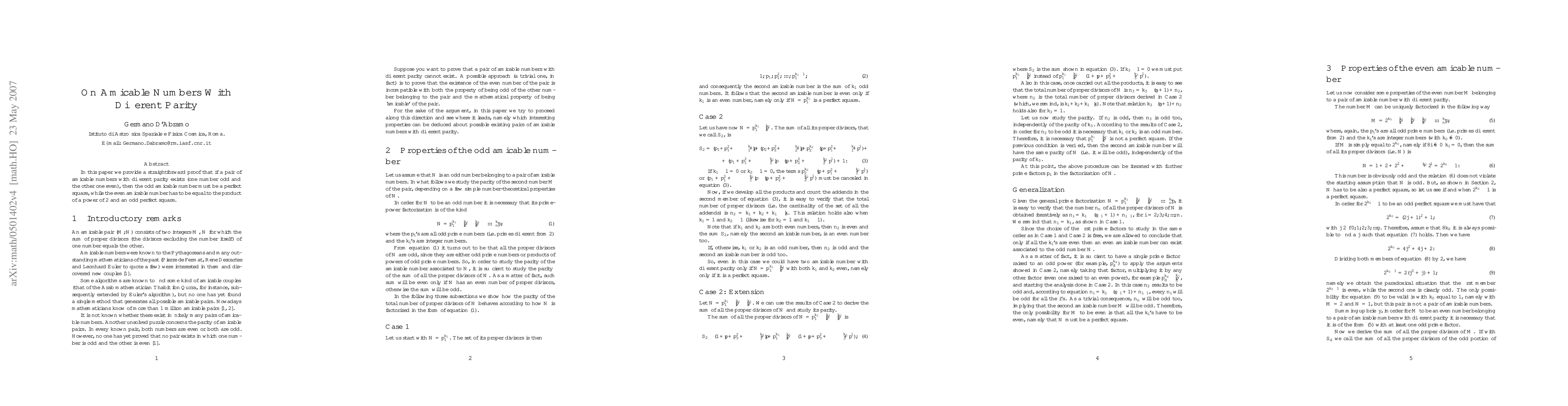 A study found that if amicable numbers with different parity exist, one odd number is a perfect square and the other even number is a product of a power of 2 and an odd perfect square.