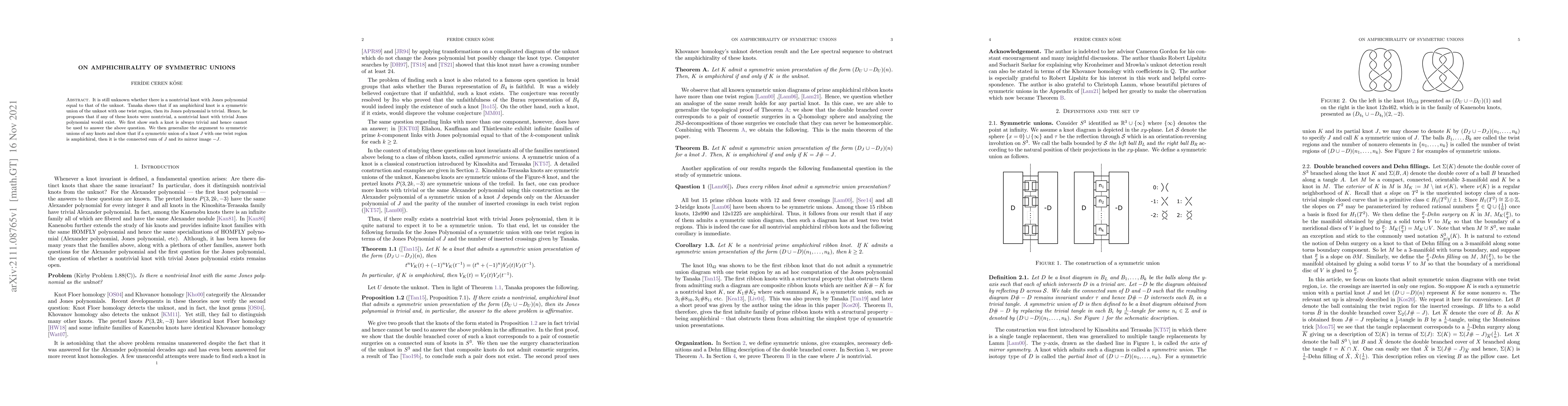Researchers show that if a knot is amphichiral and formed by symmetrically combining the unknot with one twist region, it has a trivial Jones polynomial, contradicting the possibility of nontrivial knots with this property.