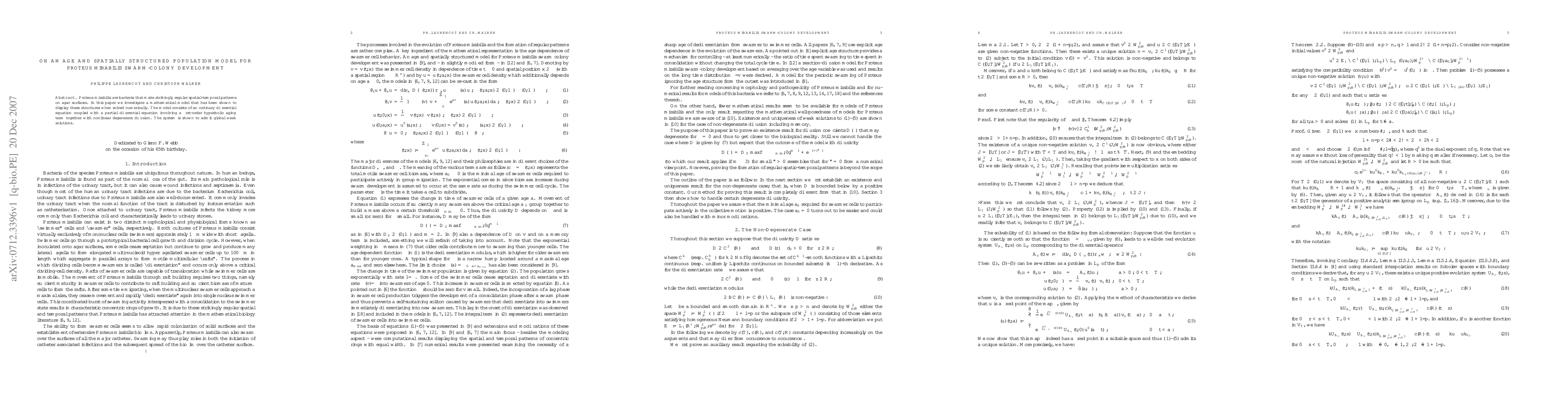 Proteus mirabilis are bacteria that make strikingly regular spatial-temporal patterns on agar surfaces. In this paper we investigate a mathematical model that has been shown to display these structures when solved numerically. The model consists of an ordinary differential equation coupled with a partial differential equation involving a first-order hyperbolic aging term together with nonlinear degenerate diffusion. The system is shown to admit global weak solutions.