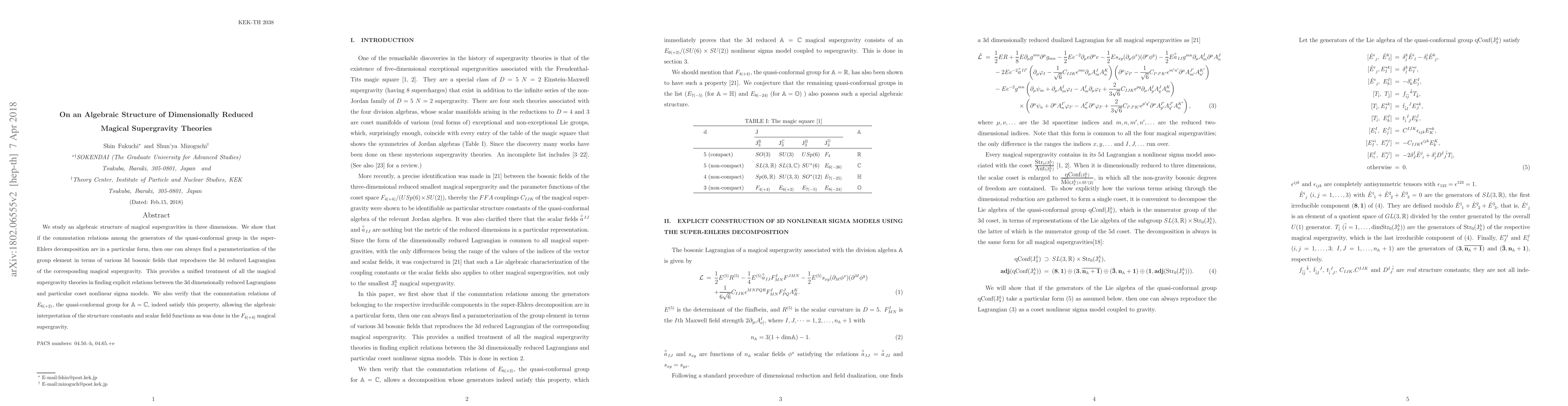 This paper explores the algebraic structure underlying three-dimensional magical supergravities, demonstrating that specific commutation relations among quasi-conformal group generators enable a parameterization of group elements using 3d bosonic fields. It confirms that $E_{6(+2)}$ satisfies these relations, mirroring the algebraic interpretation seen in $F_{4(+4)}$ magical supergravity.