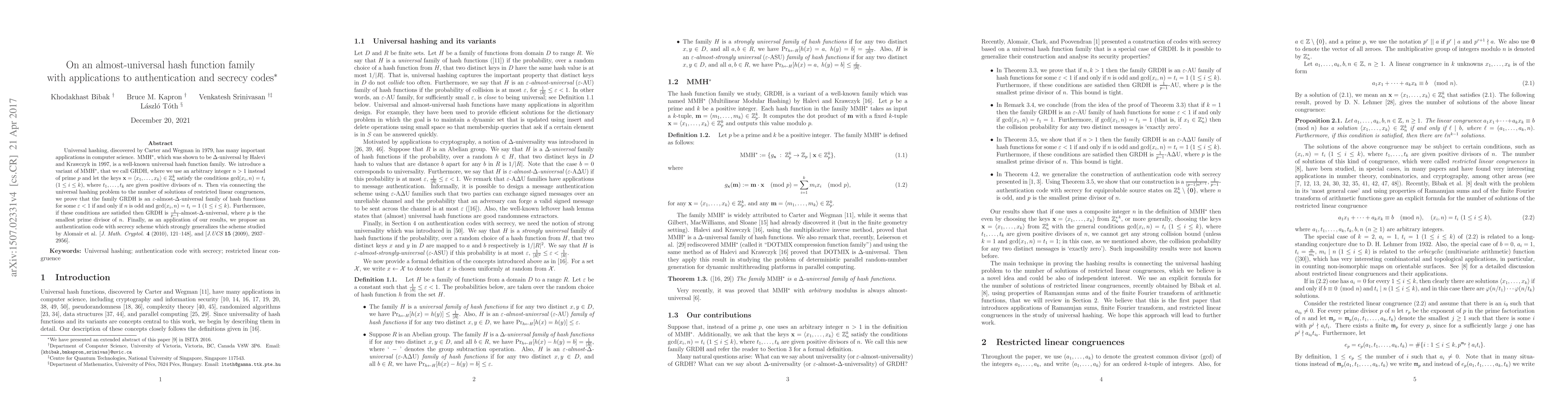 This paper introduces a variant of the MMH$^*$ universal hash function family, called GRDH, which uses arbitrary integers instead of primes and specific key conditions. The authors prove that GRDH is an $\varepsilon$-almost-$\Delta$-universal hash function family under certain conditions, and apply their findings to propose a generalized authentication code with secrecy scheme.