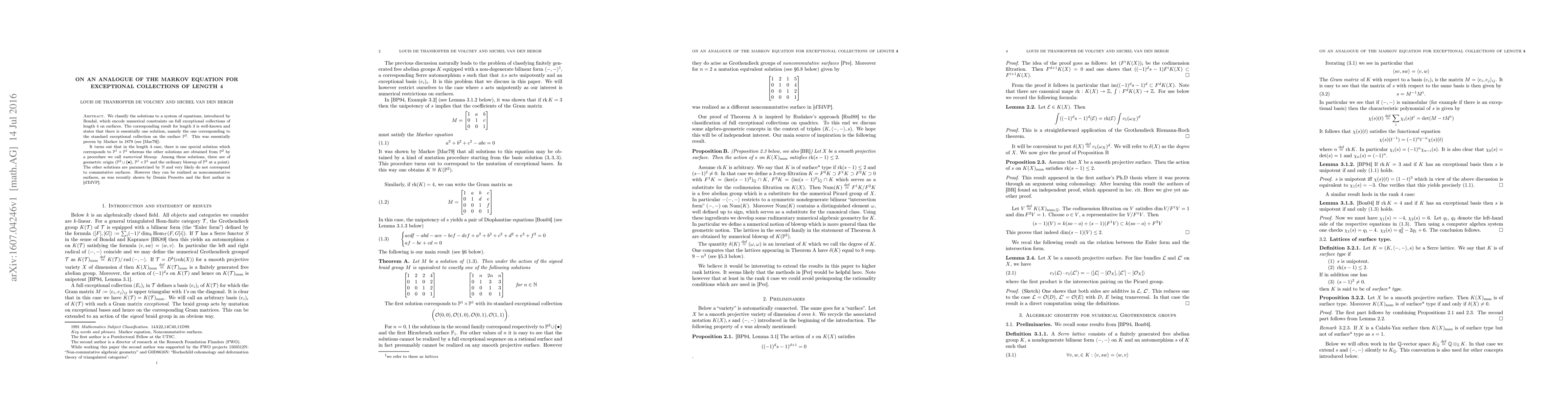 We classify the solutions to a system of equations, introduced by Bondal, which encode numerical constraints on full exceptional collections of length 4 on surfaces. The corresponding result for length 3 is well-known and states that there is essentially one solution, namely the one corresponding to the standard exceptional collection on the surface $\mathbb{P}^2$. This was essentially proven by Markov in 1879. It turns out that in the length 4 case, there is one special solution which corresponds to $\mathbb{P}^1\times\mathbb{P}^1$ whereas the other solutions are obtained from $\mathbb{P}^2$ by a procedure we call numerical blowup. Among these solutions, three are of geometric origin ($\mathbb{P}^2\cup \{\bullet\}$, $\mathbb{P}^1\times\mathbb{P}^1$ and the ordinary blowup of $\mathbb{P}^2$ at a point). The other solutions are parametrized by $\mathbb{N}$ and very likely do not correspond to commutative surfaces. However they can be realized as noncommutative surfaces, as was recently shown by Dennis Presotto and the first author.