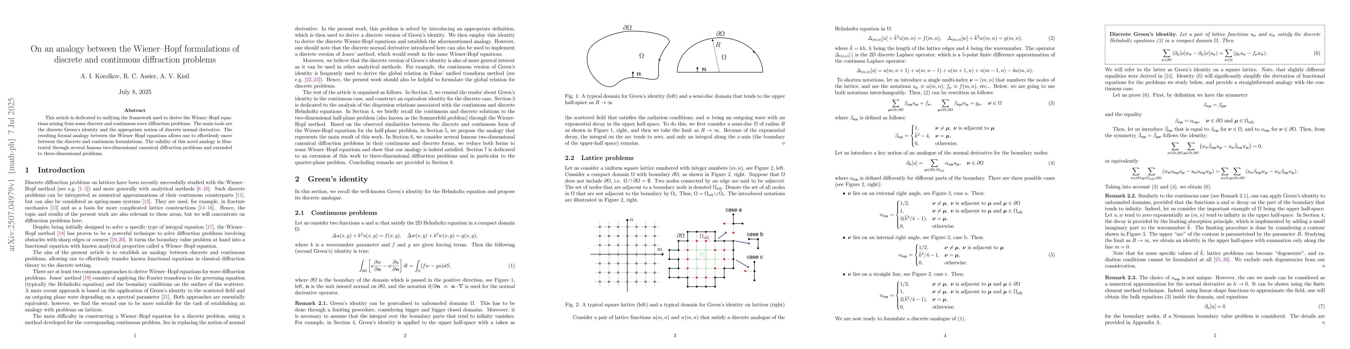 This article is dedicated to unifying the framework used to derive the Wiener--Hopf equations arising from some discrete and continuous wave diffraction problems.The main tools are the discrete Green's identity and the appropriate notion of discrete normal derivative. The resulting formal analogy between the Wiener--Hopf equations allows one to effortlessly move between the discrete and continuous formulations. The validity of this novel analogy is illustrated through several famous two-dimensional canonical diffraction problems and extended to three-dimensional problems.