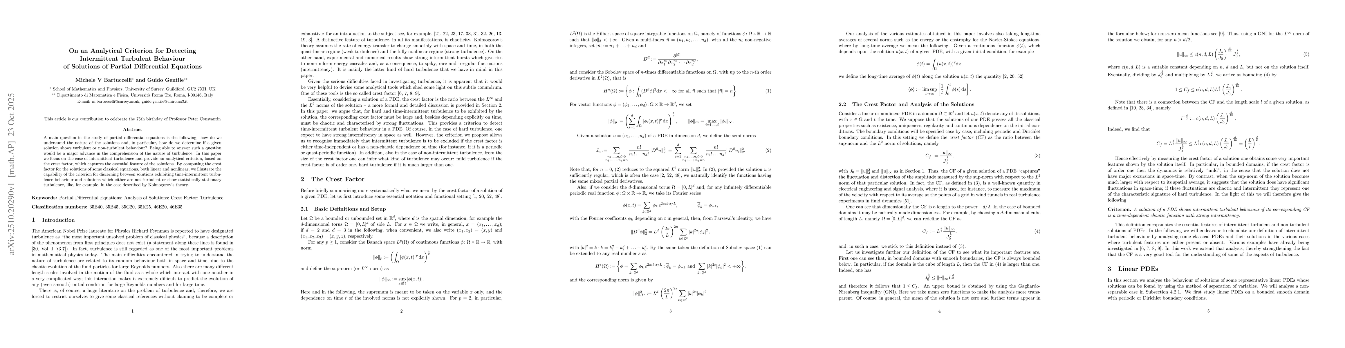 A main question in the study of partial differential equations is the following: how do we understand the nature of the solutions and, in particular, how do we determine if a given solution shows turbulent or non-turbulent behaviour? Being able to answer such a question would be a major advance in the comprehension of the nature of turbulence. In this paper we focus on the case of intermittent turbulence and provide an analytical criterion, based on the crest factor, which captures the essential feature of the solutions. By computing the crest factor for the solutions of some classical equations, both linear and nonlinear, we illustrate the capability of the criterion for discerning between solutions exhibiting time-intermittent turbulence behaviour and solutions which either are not turbulent or show statistically stationary turbulence, like, for example, in the case described by Kolmogorov's theory.