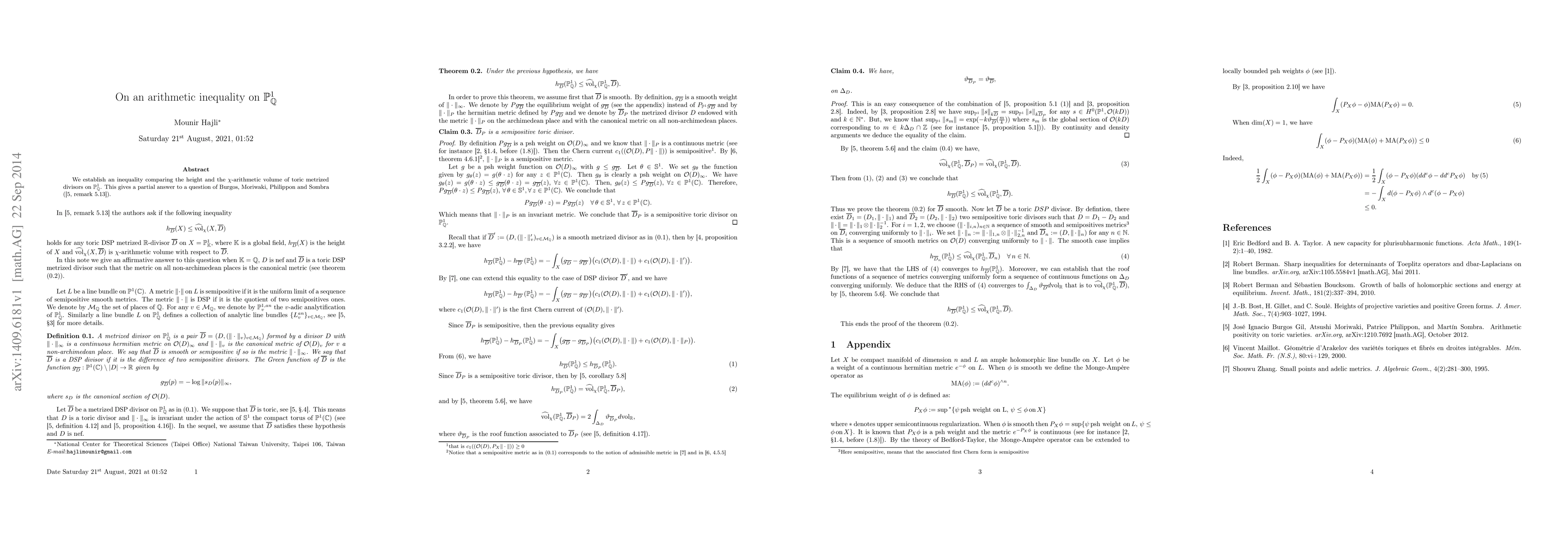 The paper establishes an inequality relating the height and $\chi$-arithmetic volume of toric metrized divisors on $\mathbb{P}^1_{\mathbb{Q}}$, contributing to a question posed by Burgos, Moriwaki, Philippon, and Sombra.