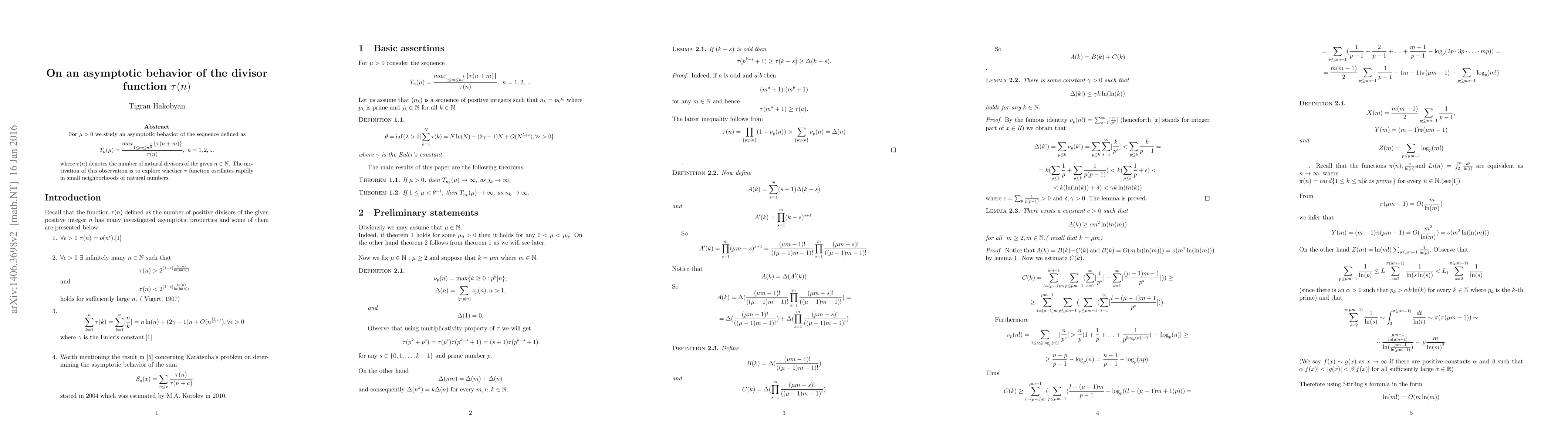 For $\mu>0$ we study an asymptotic behavior of the sequence defined as $$T_{n}(\mu)=\frac{max_{1\leq m \leq {n^{\frac{1}{\mu}}}}\{\tau (n + m)\}}{\tau(n)},\ n=1,2,...$$ where $\tau(n)$ denotes the number of natural divisors of the given $n\in \mathbb{N}$. The motivation of this observation is to explore whether $\tau$ function oscillates rapidly in small neighborhoods of natural numbers.