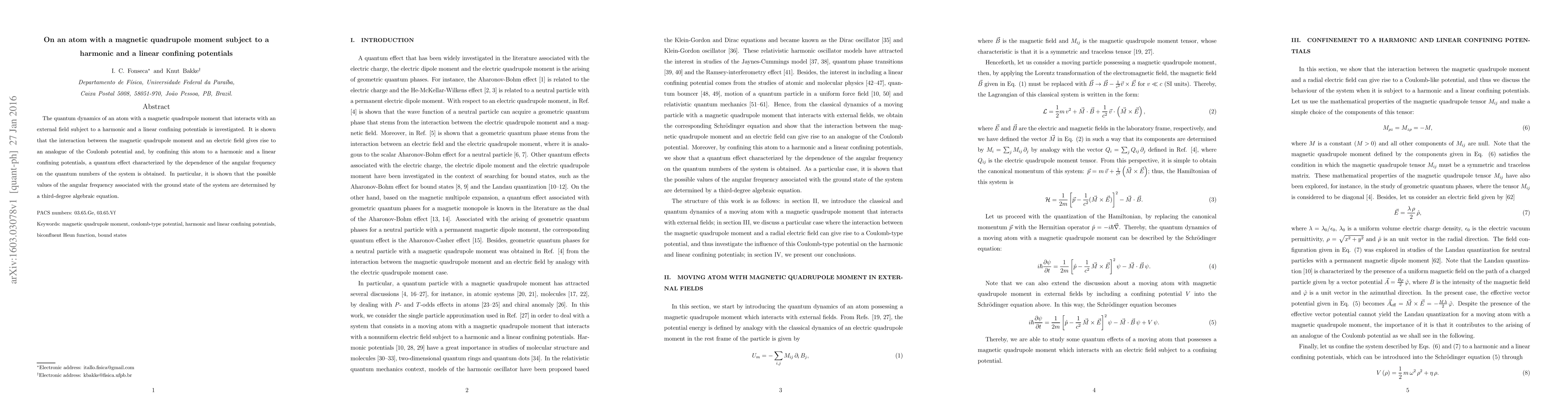 The quantum dynamics of an atom with a magnetic quadrupole moment that interacts with an external field subject to a harmonic and a linear confining potentials is investigated. It is shown that the interaction between the magnetic quadrupole moment and an electric field gives rise to an analogue of the Coulomb potential and, by confining this atom to a harmonic and a linear confining potentials, a quantum effect characterized by the dependence of the angular frequency on the quantum numbers of the system is obtained. In particular, it is shown that the possible values of the angular frequency associated with the ground state of the system are determined by a third-degree algebraic equation.