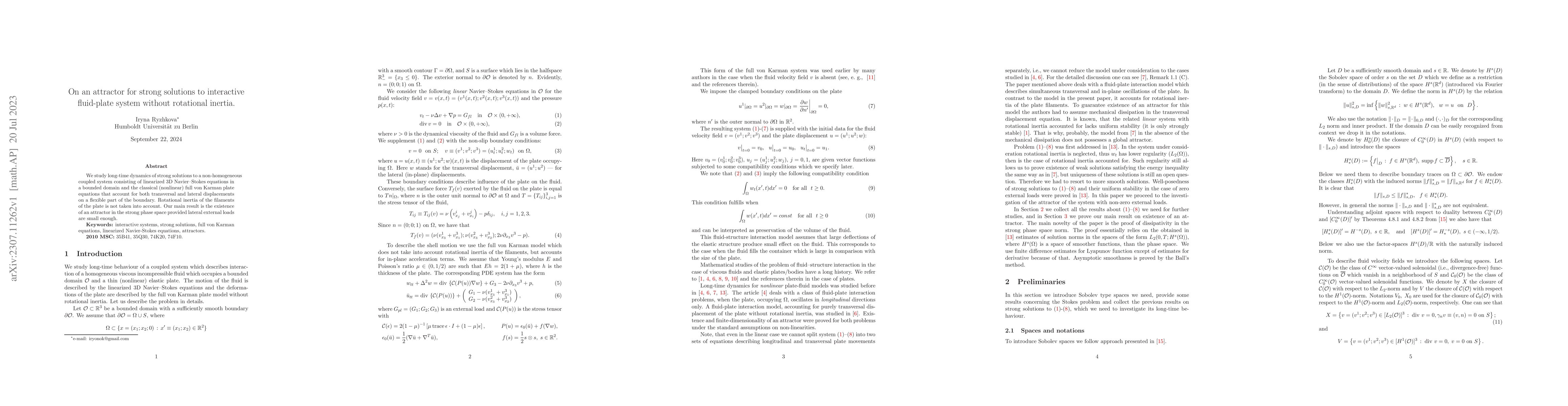 Summary: This paper investigates the long-term dynamics of strong solutions to a coupled fluid-plate system, focusing on the existence of an attractor under small lateral external loads, while neglecting the rotational inertia of the plate's filaments. The study combines linearized 3D Navier-Stokes equations with the nonlinear von Karman plate equations.