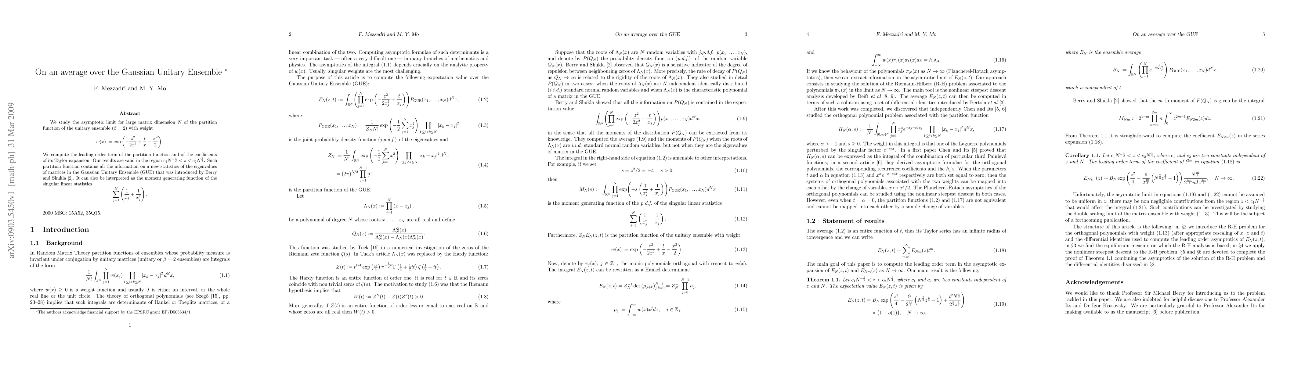 We study the asymptotic limit for large matrix dimension N of the partition function of the unitary ensemble with weight exp(-z^2/2x^2 + t/x - x^2/2). We compute the leading order term of the partition function and of the coefficients of its Taylor expansion. Our results are valid in the range N^(-1/2) < z < N^(1/4). Such partition function contains all the information on a new statistics of the eigenvalues of matrices in the Gaussian Unitary Ensemble (GUE) that was introduced by Berry and Shukla (J. Phys. A: Math. Theor., Vol. 41 (2008), 385202, arXiv:0807.3474). It can also be interpreted as the moment generating function of a singular linear statistics.
