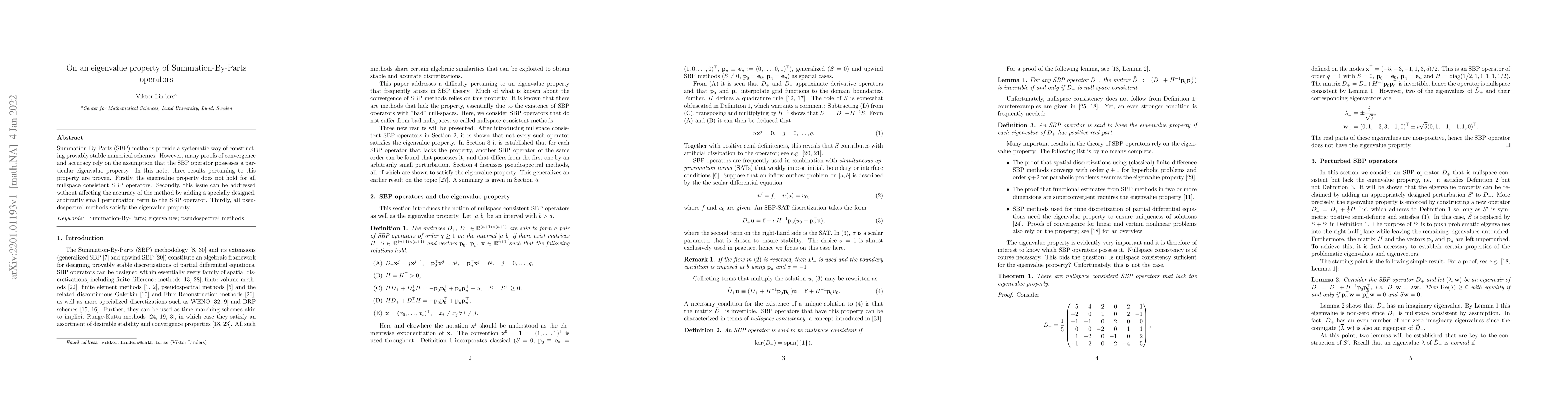 Researchers prove three key findings about Summation-By-Parts operators: not all nullspace consistent SBP operators have the desired eigenvalue property, a small perturbation can address this issue without affecting accuracy, and pseudospectral methods satisfy the property.