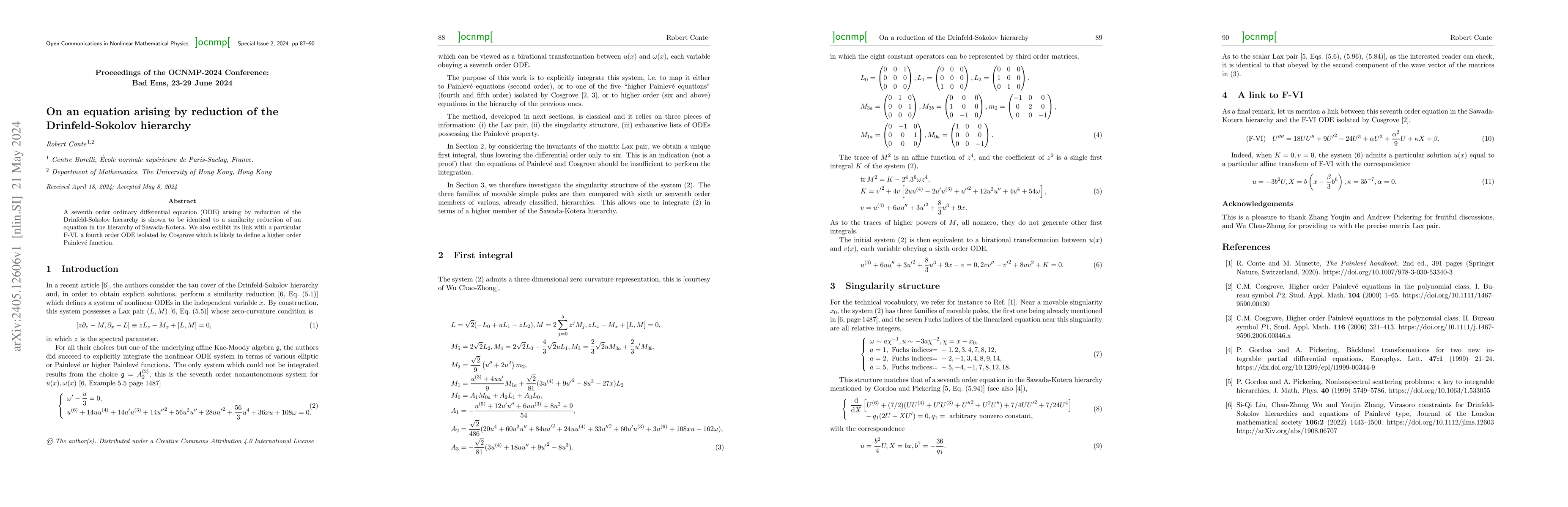 Summary: This paper establishes the equivalence of a seventh-order ODE derived from the Drinfeld-Sokolov hierarchy to a similarity reduced Sawada-Kotera equation, and connects it to Cosgrove's fourth-order F-VI ODE, suggesting it defines a higher-order Painlevé function.