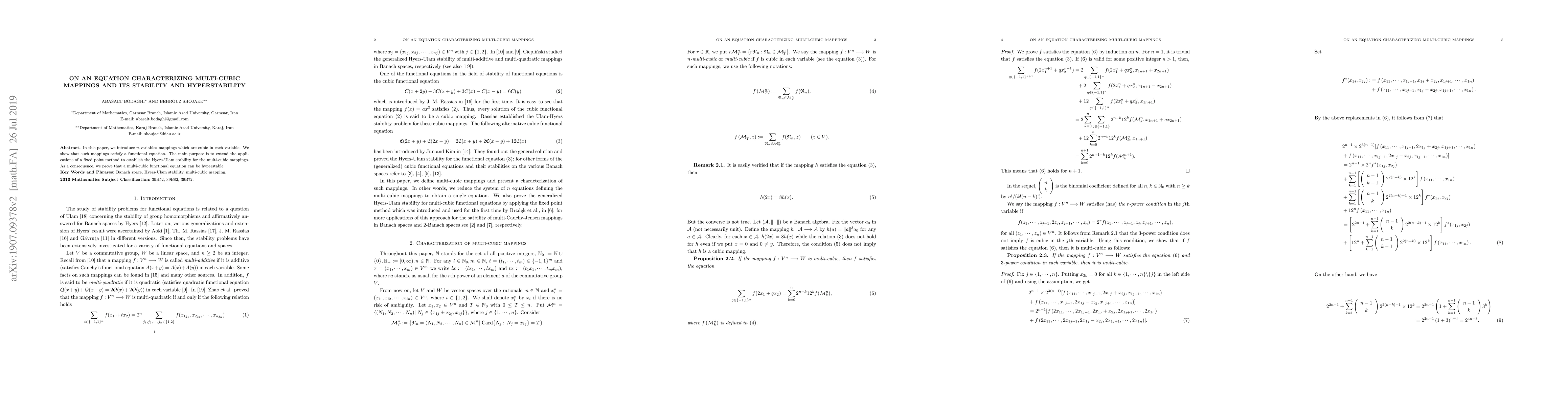 In this paper, we introduce $n$-variables mappings which are cubic in each variable. We show that such mappings satisfy a functional equation. The main purpose is to extend the applications of a fixed point method to establish the Hyers-Ulam stability for the multi-cubic mappings. As a consequence, we prove that a multi-cubic functional equation can be hyperstable.