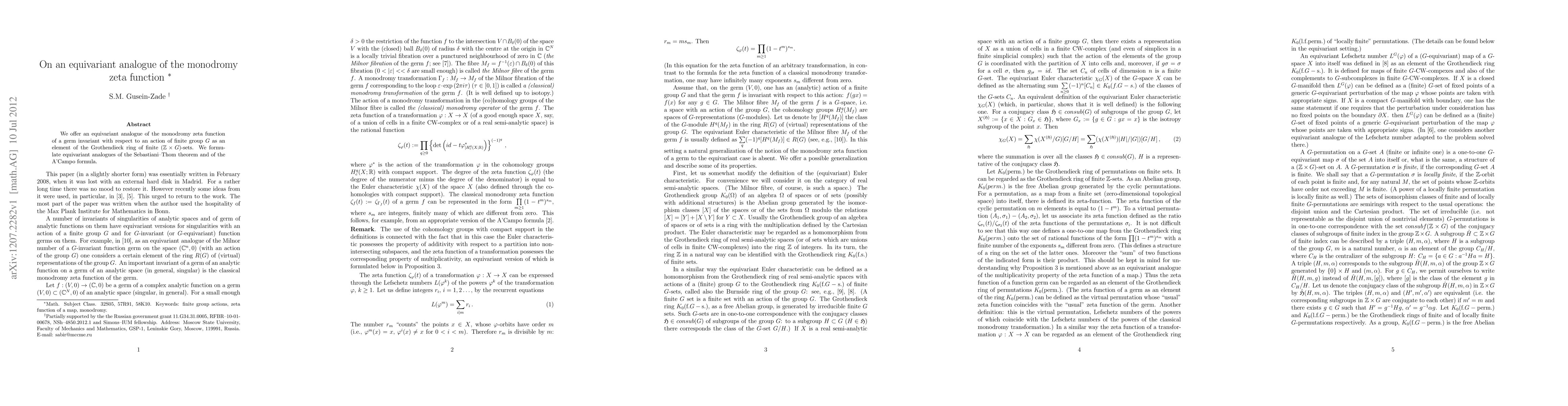 We offer an equivariant analogue of the monodromy zeta function of a germ invariant with respect to an action of finite group G as an element of the Grothendieck ring of finite (Z x G)-sets. We formulate equivariant analogues of the Sebastiani-Thom theorem and of the A'Campo formula.