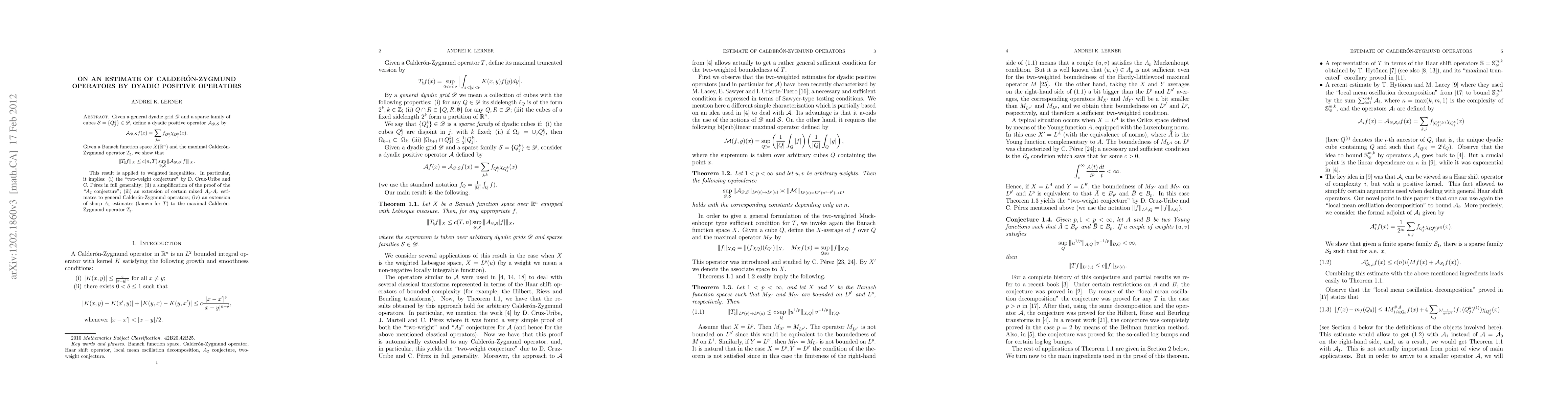 The paper establishes a key inequality relating Calderon-Zygmund operators to dyadic positive operators, with implications for weighted inequalities, including the two-weight conjecture and extensions of mixed $A_p$-$A_r$ estimates.