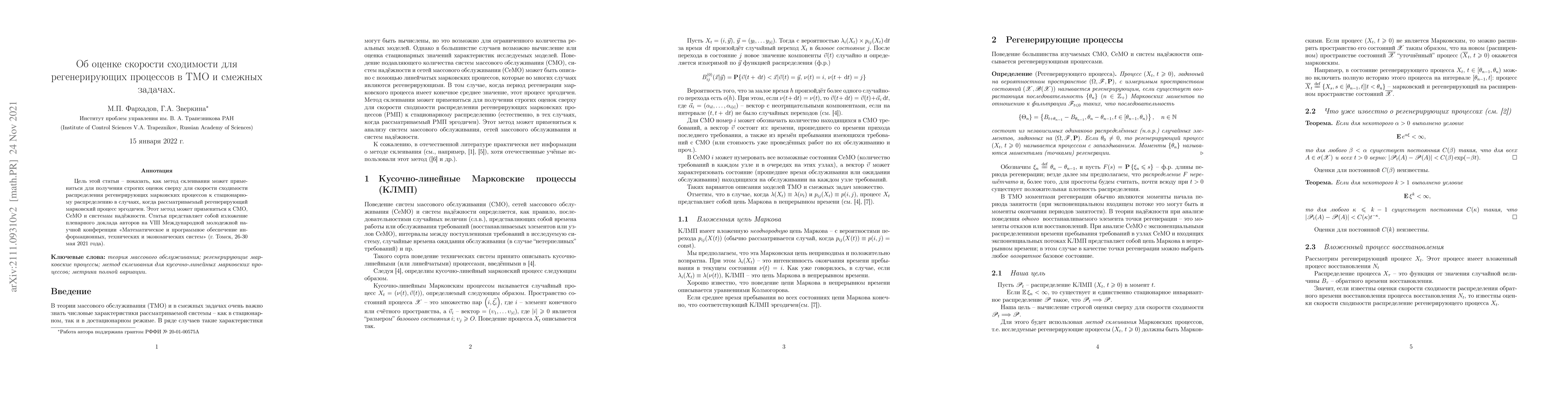 In queuing theory and related problems, it is very important to know the numerical characteristics of an investigated system - both in stationary and non-stationary modes. In some cases, such characteristics can be calculated, but this is possible for a limited number of real models. However, in most cases, it is possible to calculate or estimate the stationary values of the characteristics of the studied models. We can use linear Markov processes to model how the overwhelming majority of queuing systems (QS), reliability systems, and queuing networks (QNS) operate; the processes are regenerative in many cases. In the case when the regeneration period of the Markov process has a finite average value, this process is ergodic. An adjunction method can be used to obtain strict upper bounds for the convergence rate of the Markov process (MP) distribution to a stationary distribution (naturally, in cases where the MP under consideration is ergodic). This method can be applied to analyze queuing systems, queuing networks, and reliability systems. The purpose of this paper is to show how to use the adjunction method to obtain strict upper bounds for the MP distribution convergence rate as the regenerating Markov process converges to a stationary distribution if the Markov process is ergodic. This method can be applied to QS, QNS, and reliability systems. The article is a summary of the plenary report of the authors at the VIII International Youth Scientific Conference "Mathematical and software support of information, technical, and economic systems"; (Tomsk, May 26-30, 2021). In Russian.