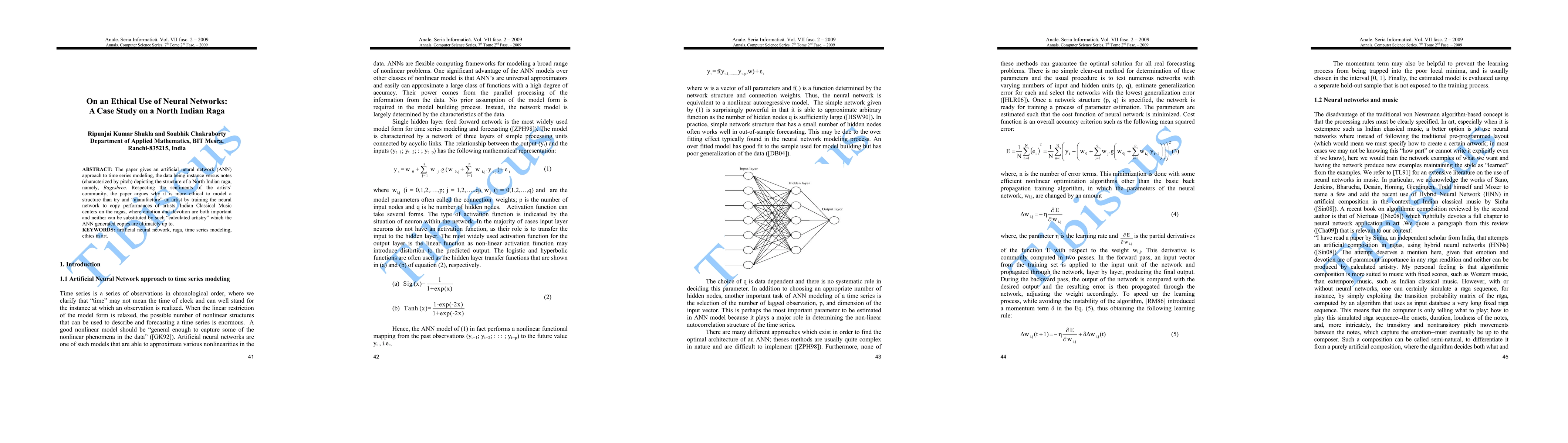 The paper gives an artificial neural network (ANN) approach to time series modeling, the data being instance versus notes (characterized by pitch) depicting the structure of a North Indian raga, namely, Bageshree. Respecting the sentiments of the artists' community, the paper argues why it is more ethical to model a structure than try and "manufacture" an artist by training the neural network to copy performances of artists. Indian Classical Music centers on the ragas, where emotion and devotion are both important and neither can be substituted by such "calculated artistry" which the ANN generated copies are ultimately up to.