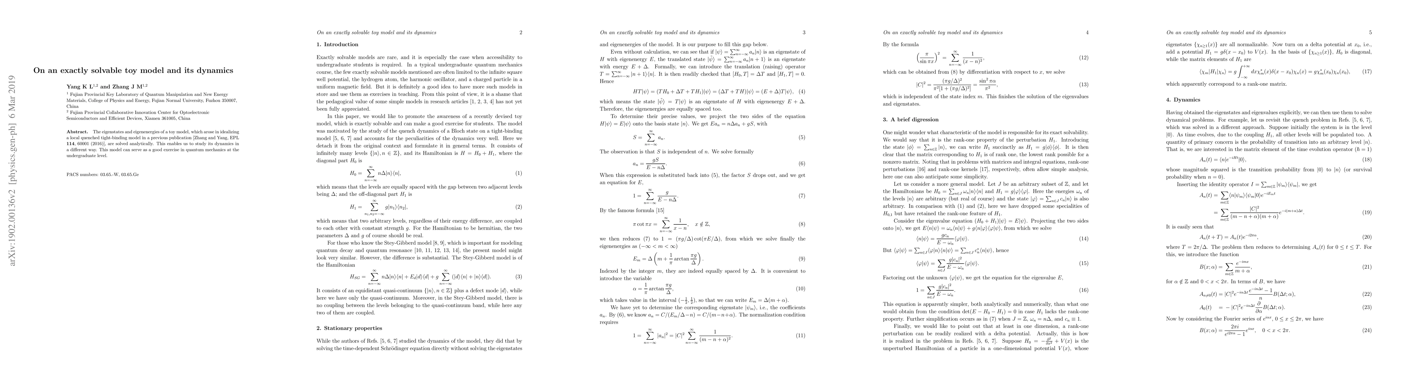 This paper presents an analytical solution for the eigenstates and eigenenergies of a simplified toy model, allowing for a unique study of its dynamics. The model serves as an instructive tool for undergraduate quantum mechanics education.