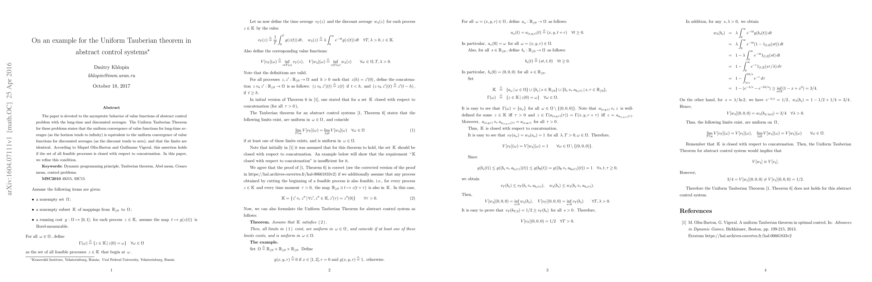 The paper is devoted to the asymptotic behavior of value functions of abstract control problem with the long-time and discounted averages. The Uniform Tauberian Theorem for these problems states that the uniform convergence of value functions for long-time~averages (as the horizon tends to infinity) is equivalent to the uniform convergence of value functions for discounted averages (as the discount tends to zero), and that the limits are identical. According to Miquel Oliu-Barton and Guillaume Vigeral, this assertion holds if the set of all feasible processes is closed with respect to concatenation. In this paper, we refine this condition.